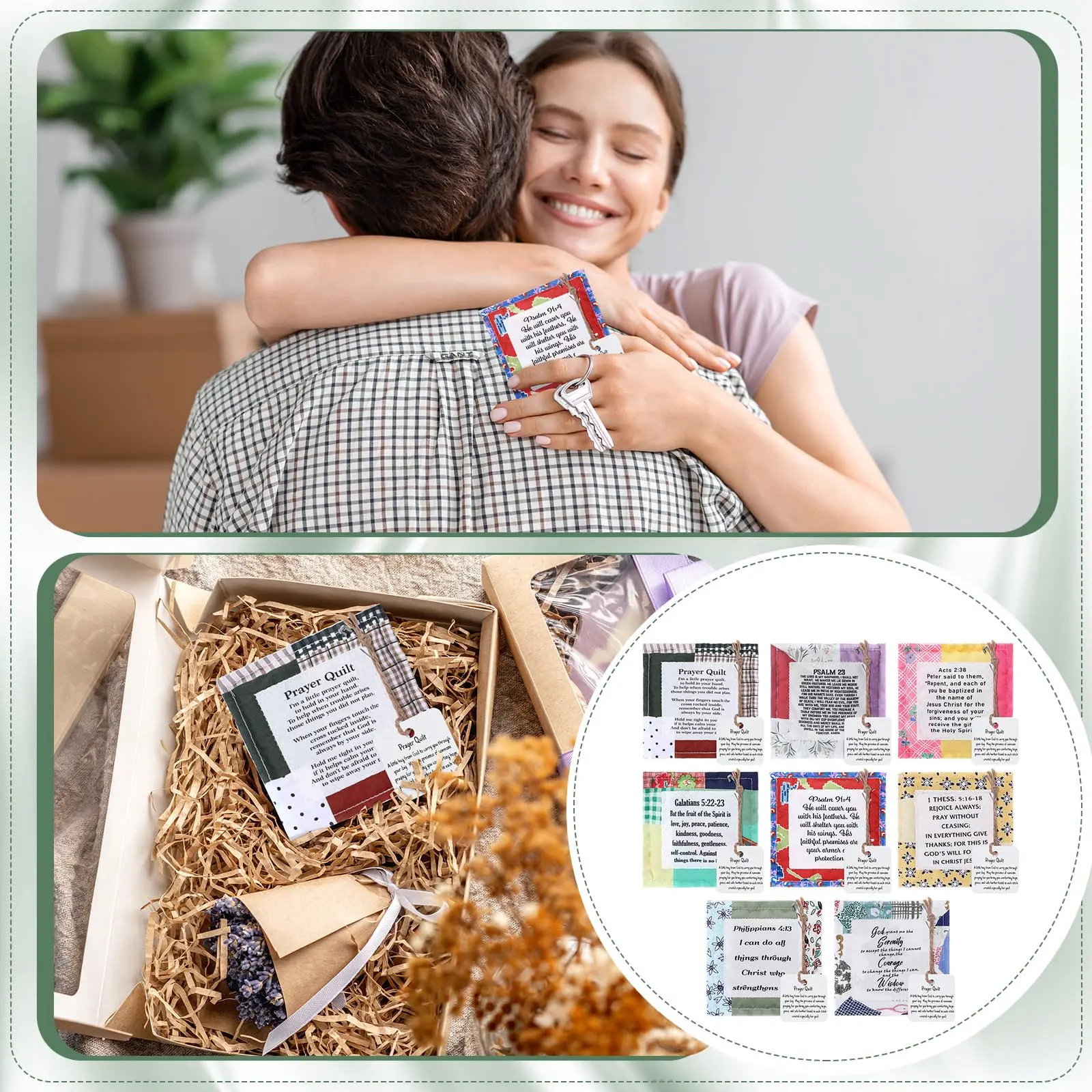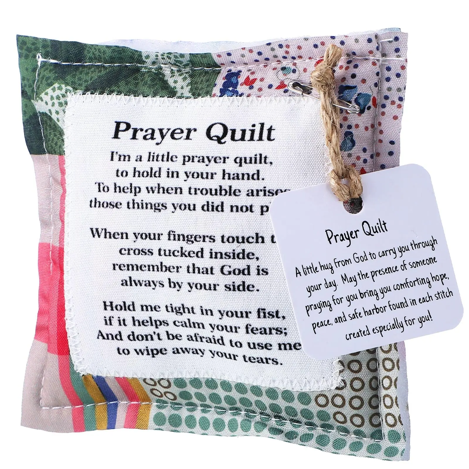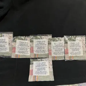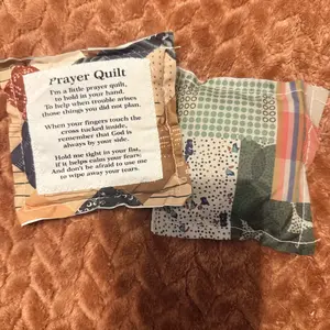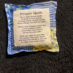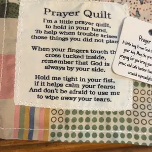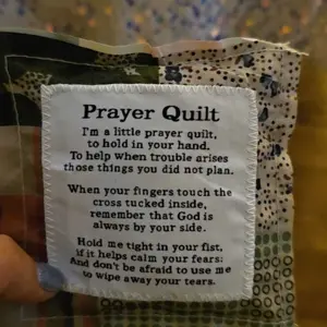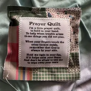 Each of our mini prayer quilts is individually made, prayer verses are sewn onto carefully design vintage prayer quilts, and a wooden cross is sewn into the interior of each quilt, so every time you touch it, you'll be reminded that God is always with you.
