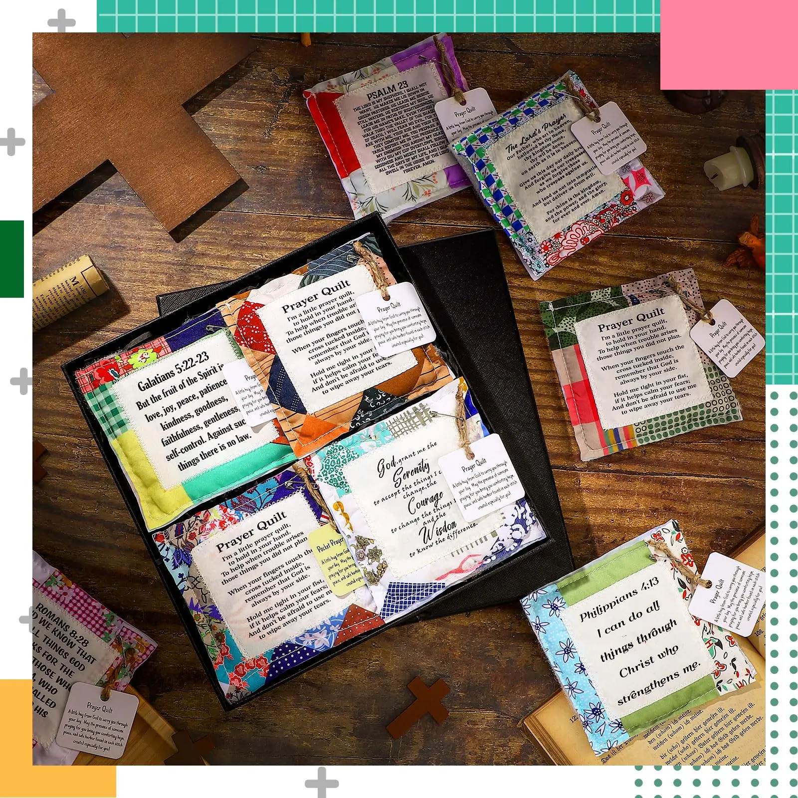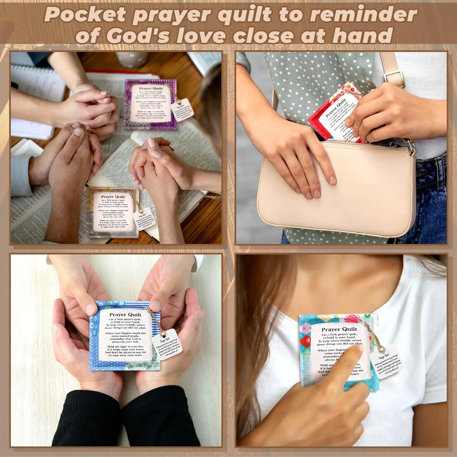 You will receive 1/2/6/8/12/16/24/28/48 prayer quilts stitched with scriptures; These prayer quilt squares feature a wooden cross in the center to comfort you and remind you of god's presence in your daily life.
