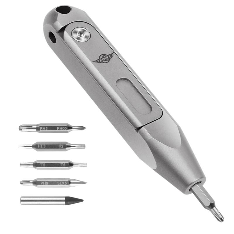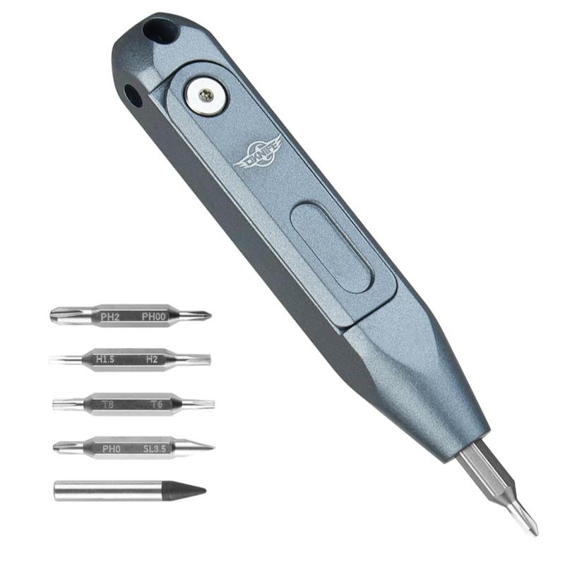 ·Hidden compartment in the handle with an easy-open cover for conveniently storing and retrieving the included 4 double-ended 4mm hex micro bits of 8 different sizes (SL3.5, PH0, T8, T6, H2, H1.5, PH2, PH00).
