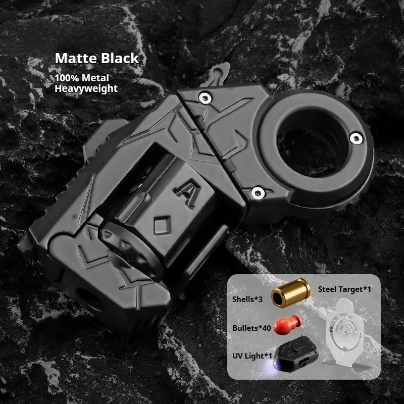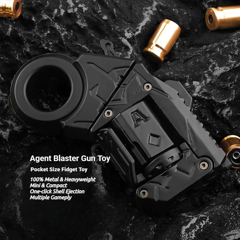 The AGENT BLASTER is a 100% metal mini fidget toy designed for stress relief and endless fun. Compact yet powerful, it features a rotatable ratcheting ring, pushing slider, unlimited rotation barrel, rotating block, can also shoot and change shapes, and one-click shell ejection for immersive gameplay.