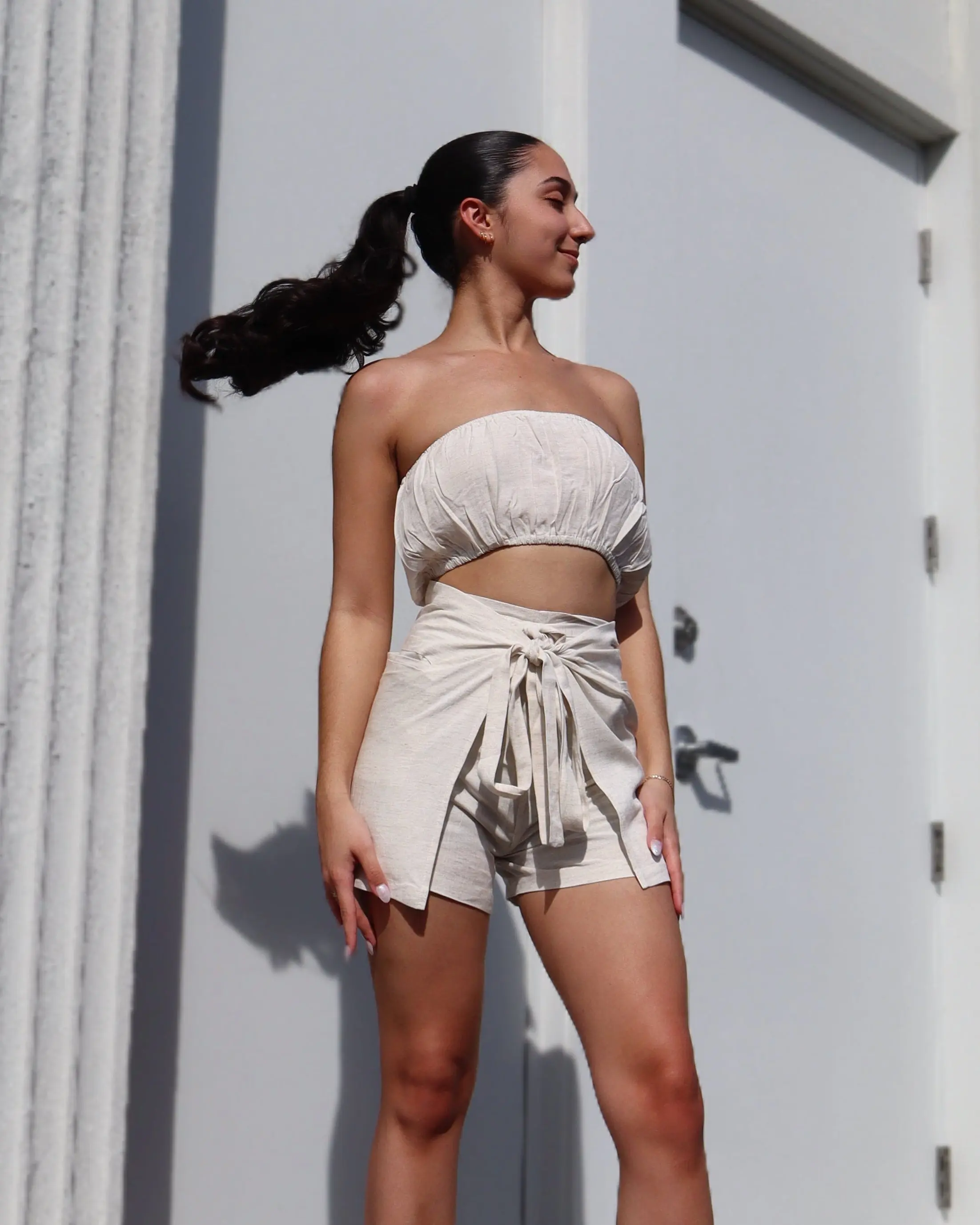NEW Our best-selling Linen Wrap Short is back and better than ever—same flattering fit, now with new elevated details. Featuring a structured yet breathable linen blend that cinches the waist and drapes beautifully over the hips, this short is designed to flatter every curve.