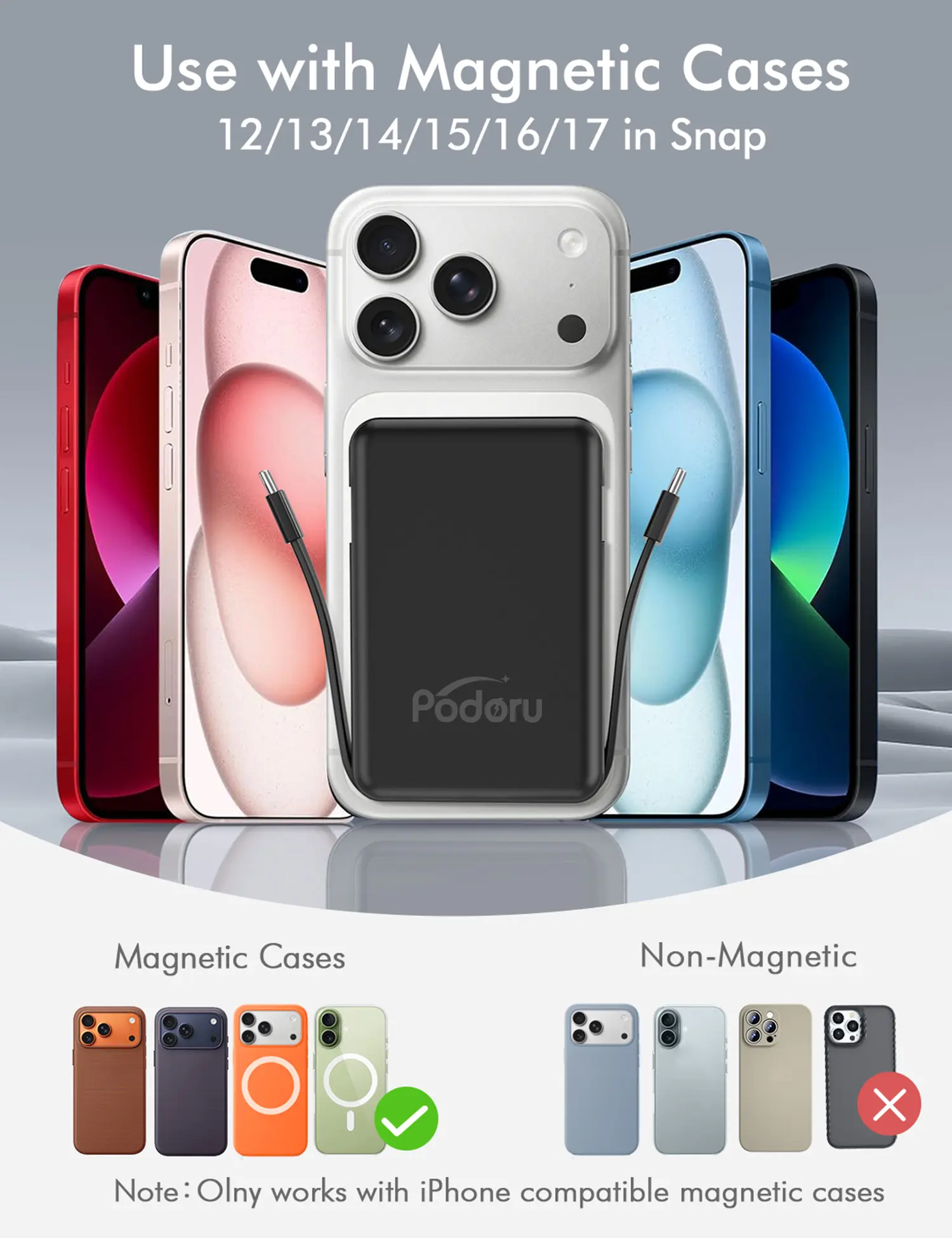 This 10000mAh podoru for MagSafe battery pack for iPhone and Android devices, but wireless charging is available for iphone 15 and above modelseries and other devices with the magnetic phone case. Some heat may be generated due to energy loss during transmission. This is a normal phenomenon.