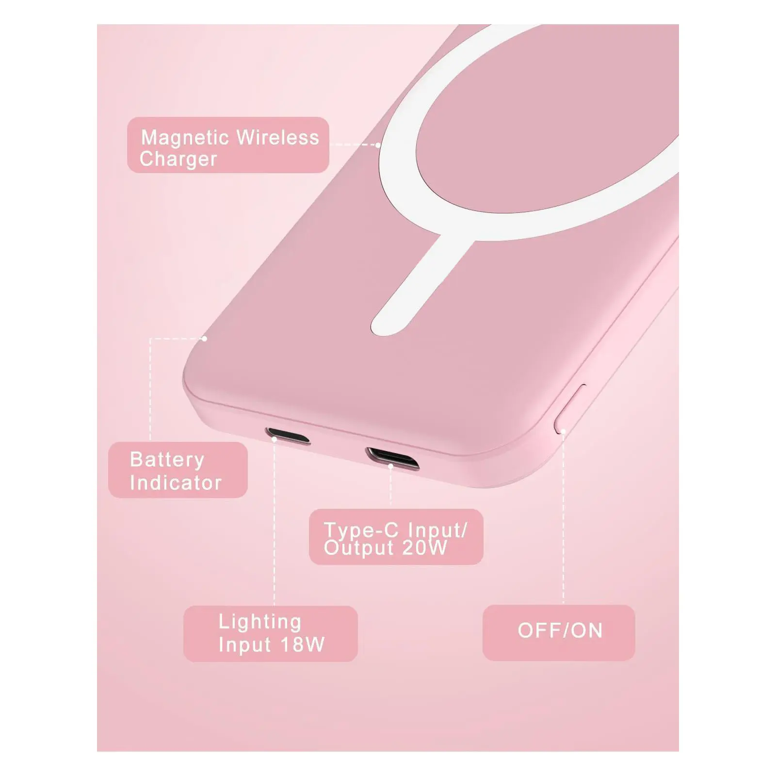 ·2 in 1 Wireless & Wired Fast Charger: This Mag-Safe battery pack can charge 2 Devices at the same time. Support 15W Max wireless charging and max 20W USB-C output; support max 12W Lighting input and max 18w USB-C input.