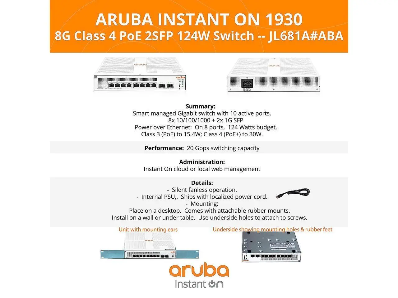 Aruba Instant On 1930 8-Port PoE Gb Ethernet 8xGE PoE (124W), 2X 1G SFP, L2+ Smart Switch US Cord (JL681A#ABA)