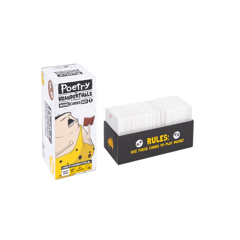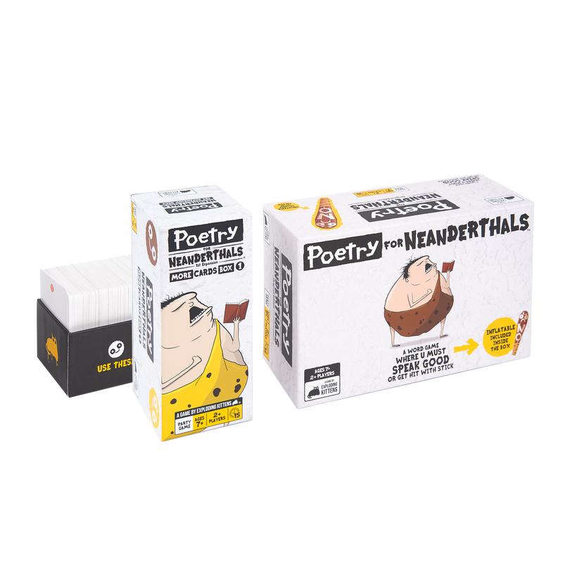 This Poetry for Neanderthals Bundle includes the original game and the More Cards Box 1 Expansion, offering everything you need for endless laughs and word-guessing mayhem.