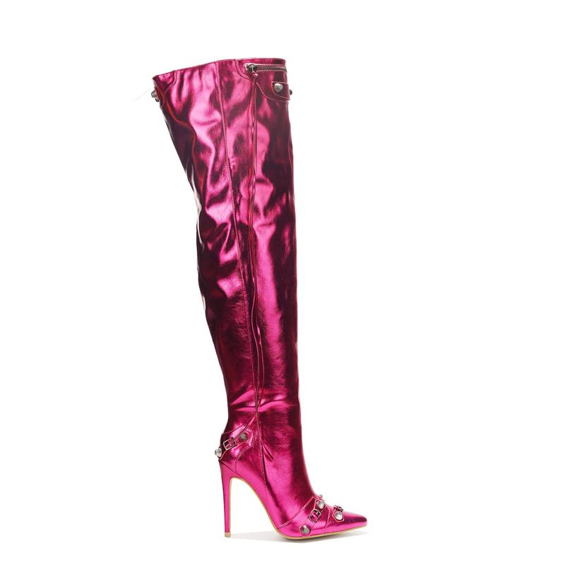 5. Pofin-2 Metallic Thigh High Pointy Toe Boots - Pink