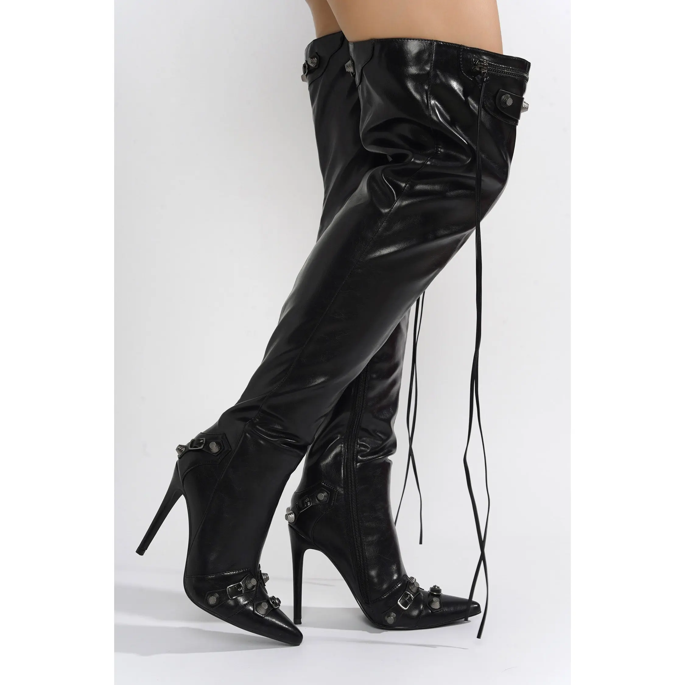 5. Pofin-2 Metallic Thigh High Pointy Toe Boots - Black