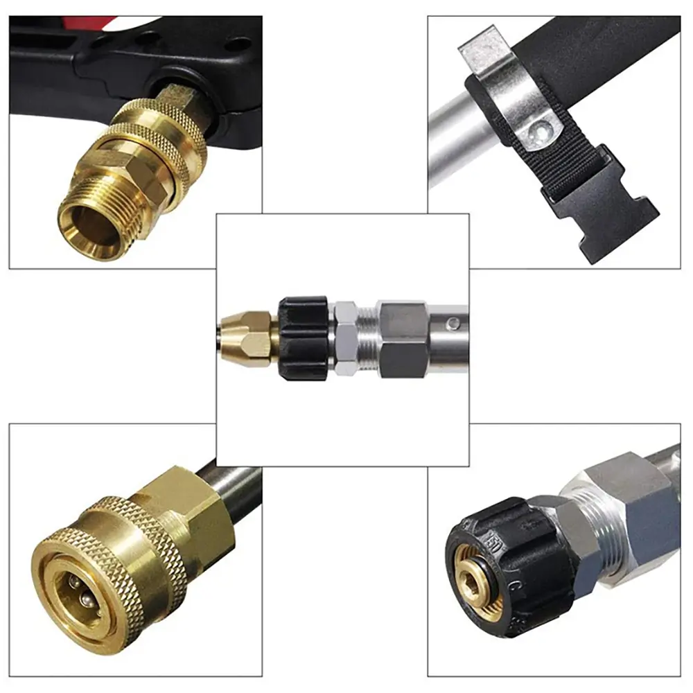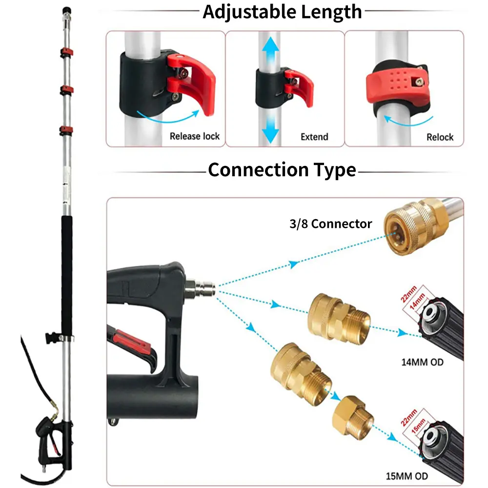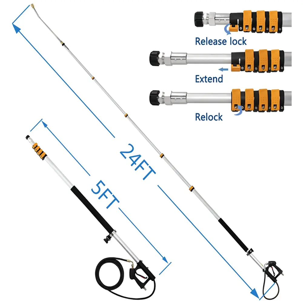 This power washer extension is made of durable and lightweight aluminum. It can be extended from 5 feet to 24 feet, and you can easily reach high places without a ladder, making your cleaning safer. The supportive strap with telescoping rod can help reduce the pressure on the neck, back and arms, better control the telescoping spray wand and optimize cleaning performance, thus saving energy. This pressure washer has a working pressure of up to 4000 PSI and cleans a wide area. And comes with a standard 3/8" quick-release fitting to fit most pressure washer accessories. The pressure washer telescopic extension is ideal for cleaning large areas such as driveways, yards, roofs, walls, and sidewalks. A sturdy telescoping extension pole with a level lock is perfect for cleaning sidewalks, roof gutters, and soffits without using a ladder.