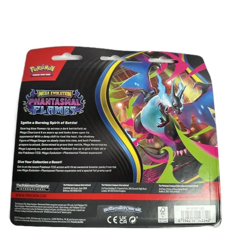 Searing blue flames rip across a dark battlefield as Mega Charizard X ex soars up and looks down upon its opponents! With a deep chill to rival the heat, the shadowy figure of Mega Gengar ex slowly rises into view, and both Pokémon prepare to attack. Determined to prove their mettle, Mega Heracross ex, Mega Lopunny ex, and even more Pokémon line up to give it their all in the Pokémon TCG: Mega Evolution-Phantasmal Flames expansion!