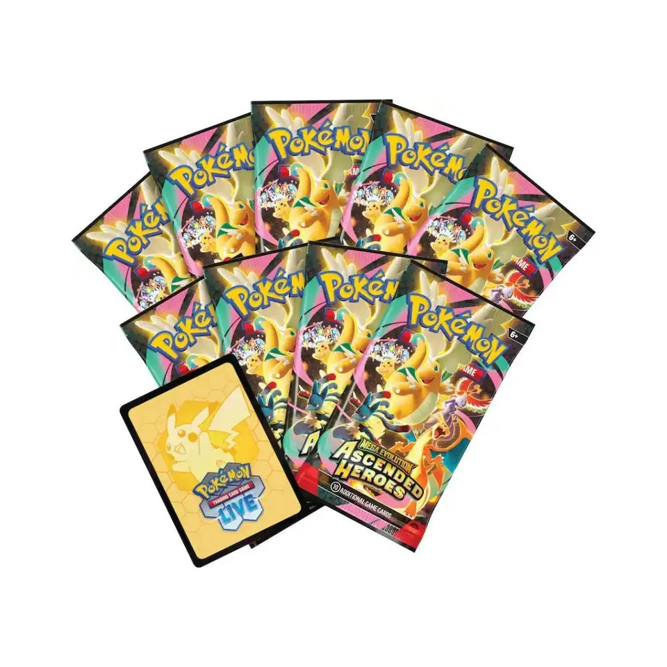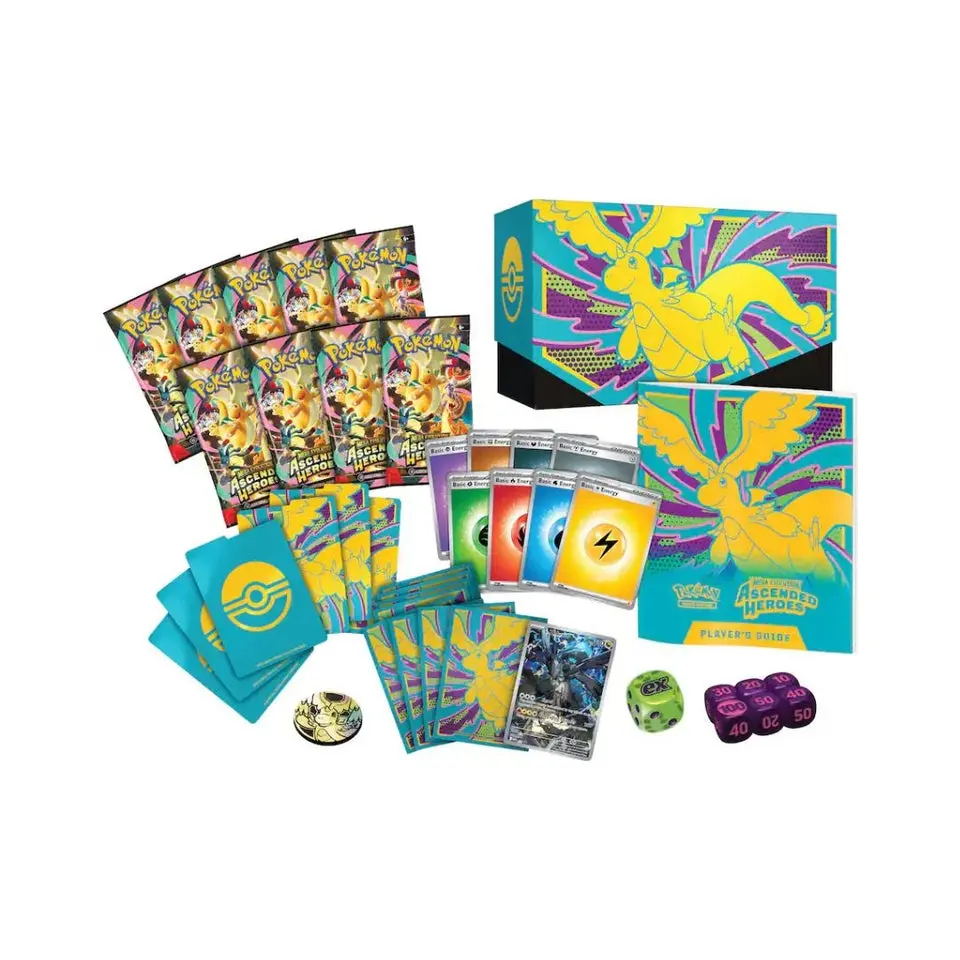 Rise to a New Challenge!  Marvel at the awesome potential as Mega Dragonite ex takes flight, leading a gathering of all-star Pokémon to battle! Trainer’s Pokémon and Stellar Tera Pokémon ex join returning and newly discovered Mega Evolution Pokémon ex, including some with special artwork showing off their biggest and boldest attacks. Celebrate the stars of Scarlet & Violet and the dawn of Mega Evolution with the Pokémon TCG: Mega Evolution—Ascended Heroes expansion! The Pokémon TCG: Ascended Heroes Elite Trainer Box includes: • 9 Pokémon TCG: Ascended Heroes booster packs • 1 full-art foil promo card featuring N’s Zekrom • 65 card sleeves • 40 Pokémon TCG Energy cards • A player’s guide to the Ascended Heroes expansion • 6 damage-counter dice • 1 competition-legal coin-flip die • 1 plastic coin • A collector’s box to hold everything, with 6 dividers to keep it organized • A code card for Pokémon Trading Card Game Liv