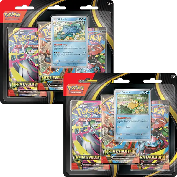 Each blister comes with 3 Mega Evolution booster packs and a promotional card of Psyduck.
