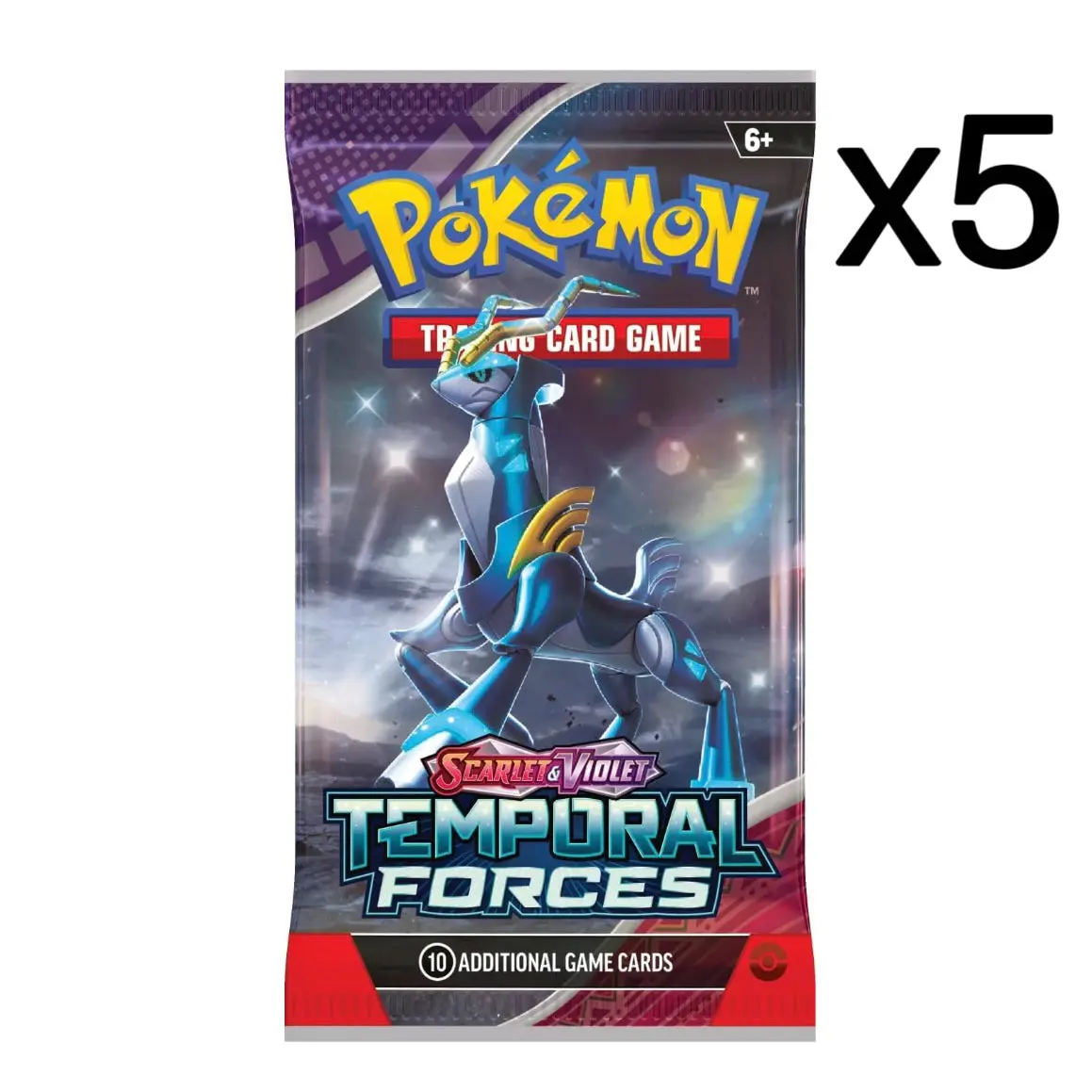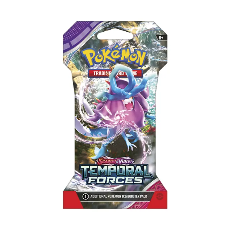 The ranks of Ancient and Future Pokémon continue to grow! Walking Wake ex breaks free of the past alongside Raging Bolt ex, while Iron Leaves ex delivers high-tech justice with Iron Crown ex. Outside Area Zero, Wugtrio and Farigiraf shift types as Tera Pokémon ex, and Pokémon Trainers everywhere prepare for the return of ACE SPEC cards with uniquely powerful effects. A rupture in time brings wild beasts and cyber visions to battle in the Pokémon TCG: Scarlet & Violet—Temporal Forces expansion!