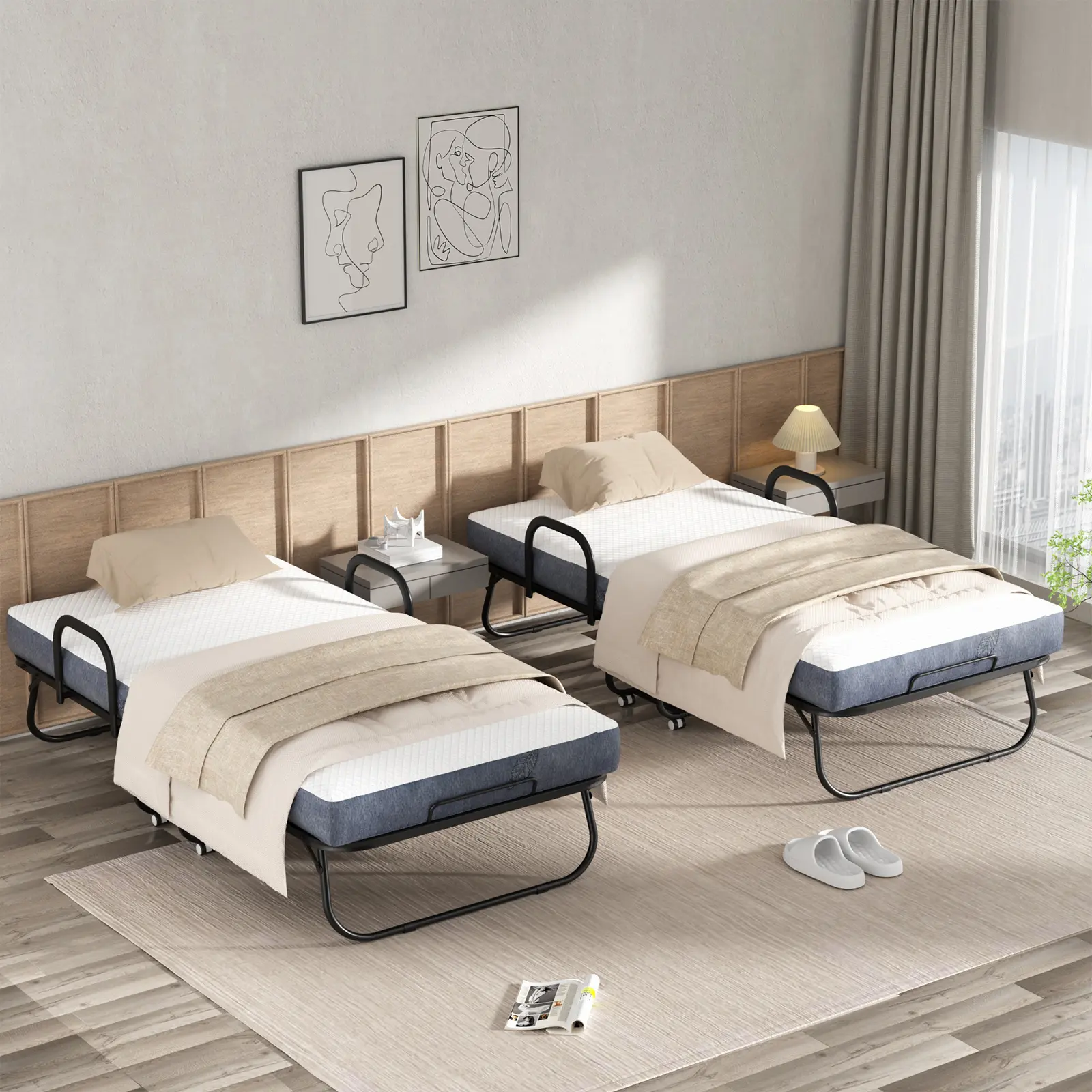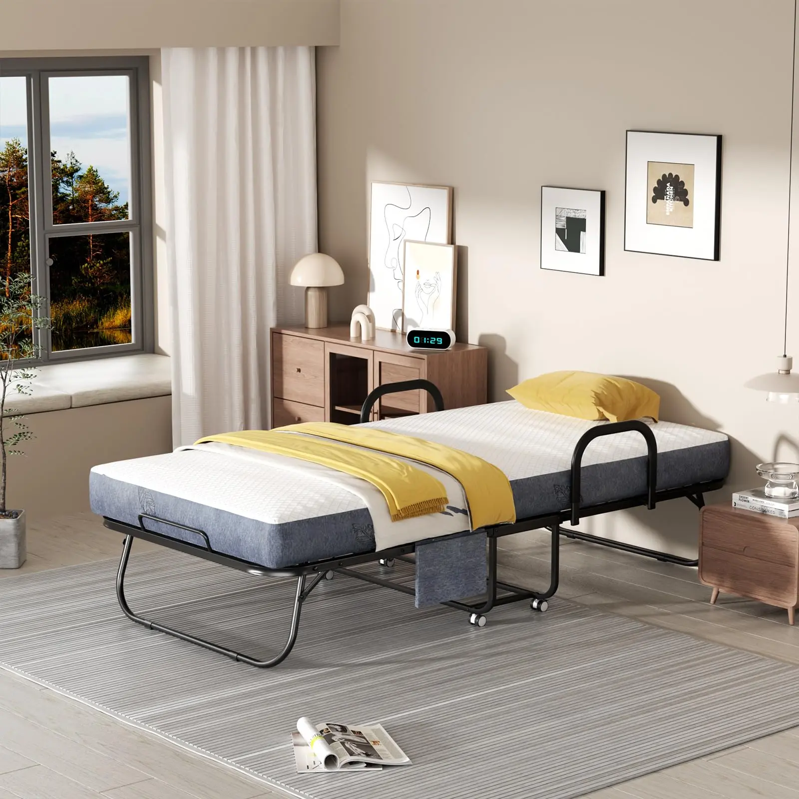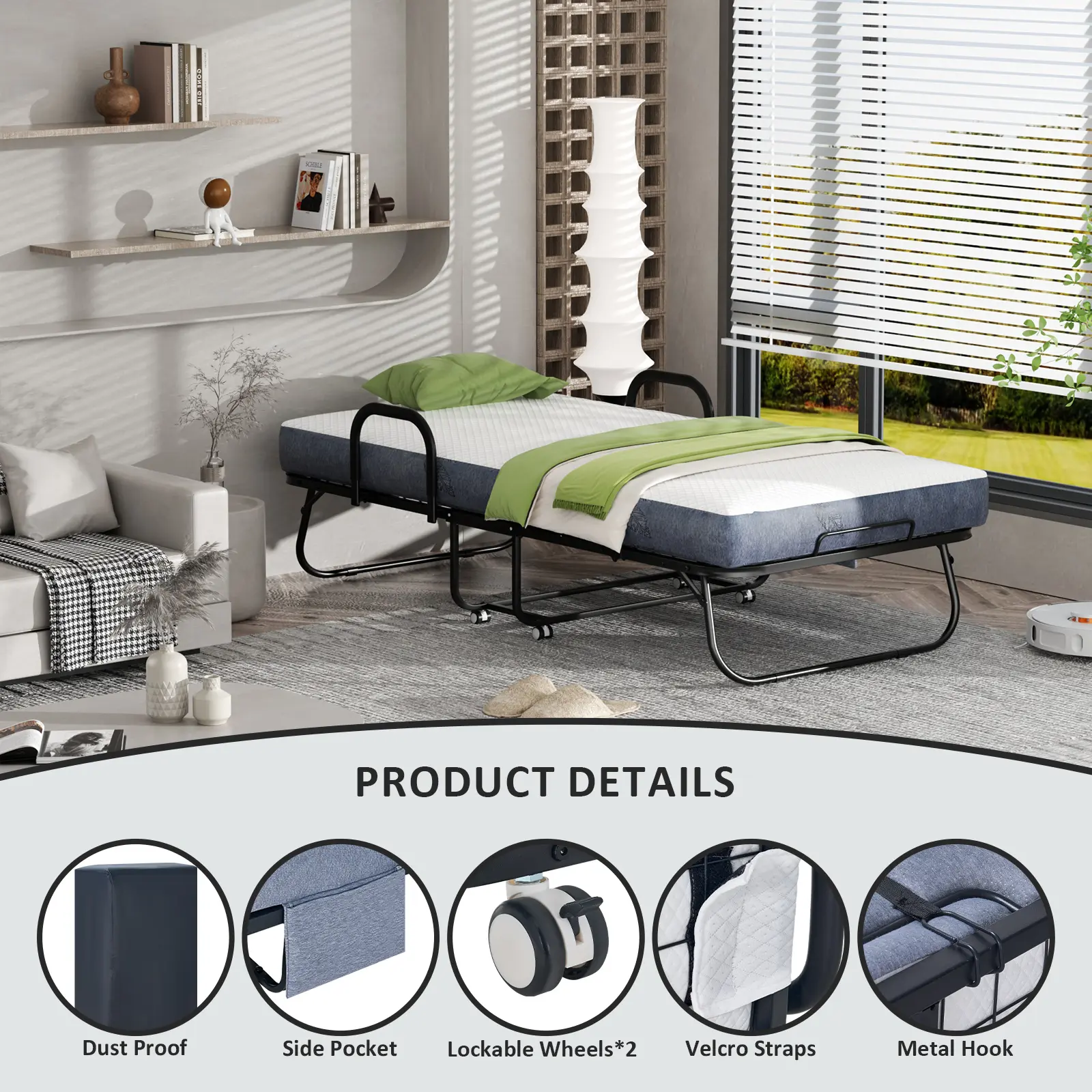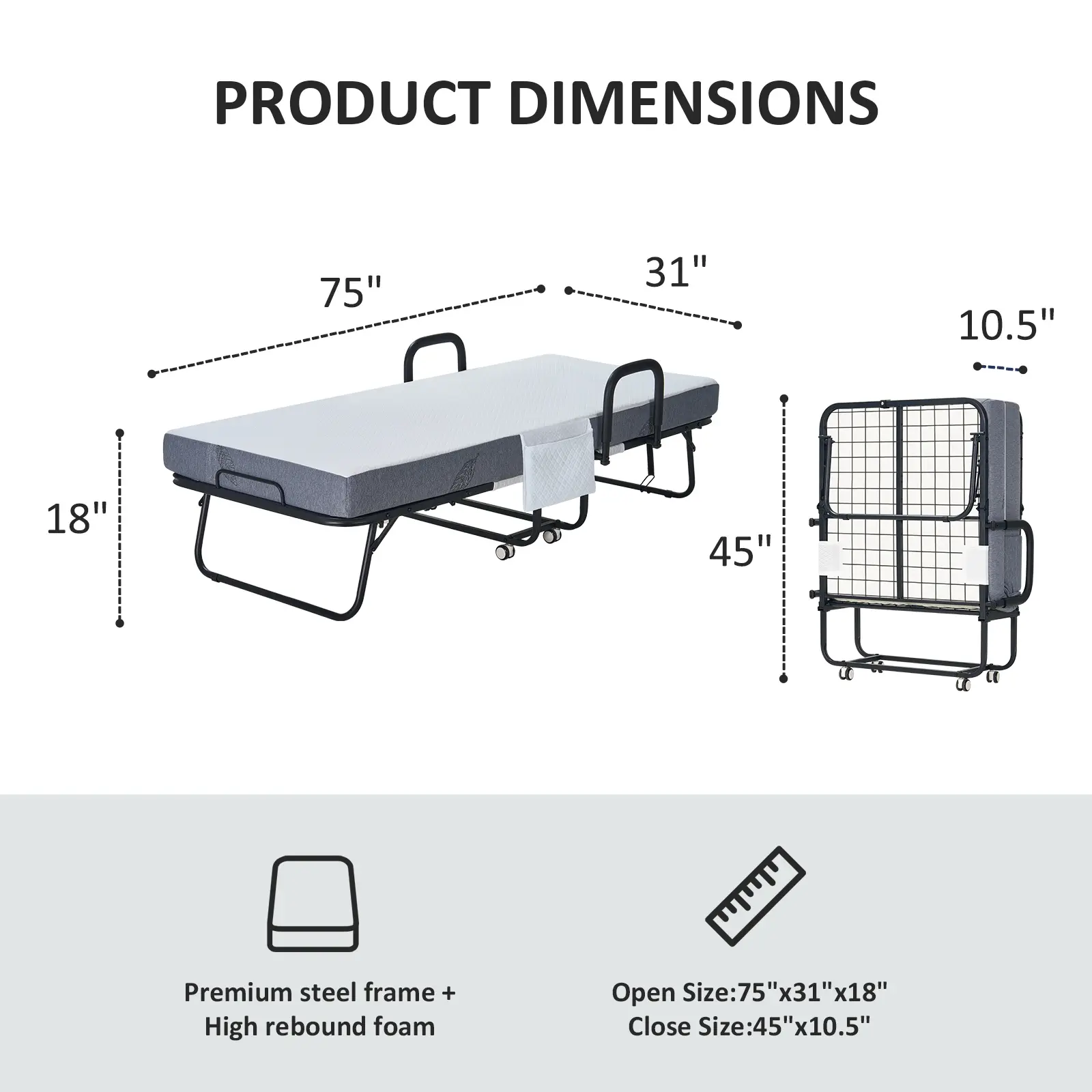 Sturdy and Durable: The single bed is made of sturdy steel frame, thickened steel pipes, and sturdy steel wires, which are not easily damaged.It can support up to 350 pounds of weight. Rollaway bed is easy to operate according to the instructions and can be quickly installed
