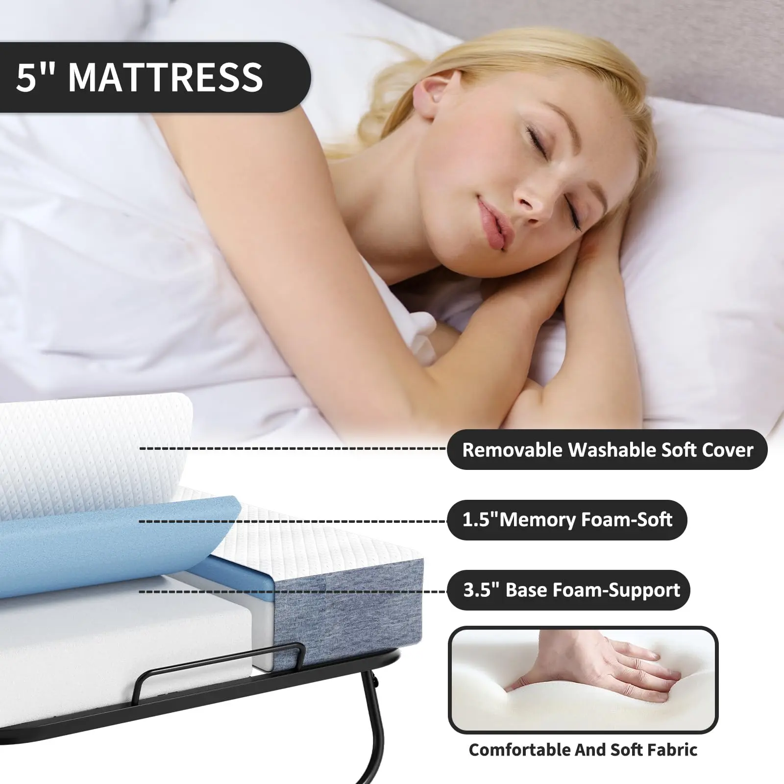 Thickened Mattress: The portable bed has 5" thickened foam mattress. It has 1.5 inches of memory foam and 3.5 inches of base foam. This makes the mattress not only more soft and comfortable, but also strong resilience and not easily deformed. This thicker mattress can provide us a better sleep experience. We use vacuum packing and need to wait for the mattress to recover original condition. Sometimes it only takes a few hours, but other times it can take up to 48 hours to fully expand