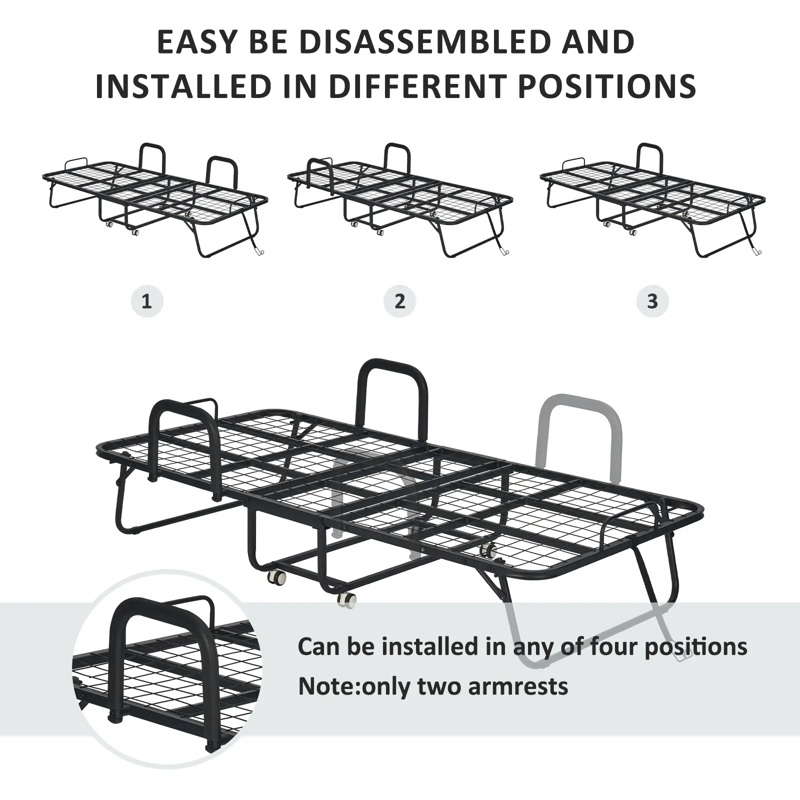 Unique and Update design: This folding bed has two armrests that can be installed in any of four positions on the sides of the bed frame. The armrests provide you with support and prevent you from falling while sleeping.This twin size bed has add a side pocket that can put things and enhance practicality. The mattress covers with a zipper, which is removable and easy to clean