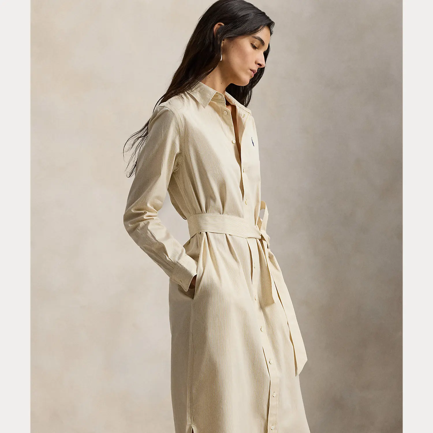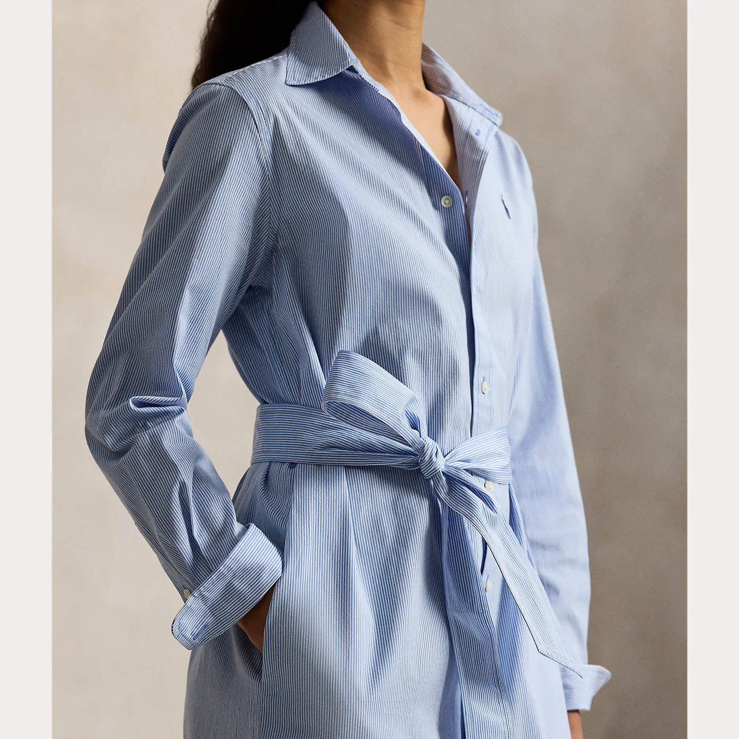 Crafted with cotton, this striped shirtdress is designed for an elongated silhouette and accented by a waist-defining self-belt. It features side on-seam pockets and a classic shirttail hem.
