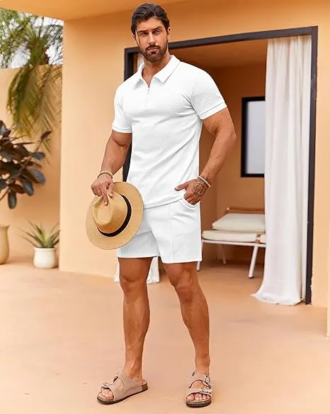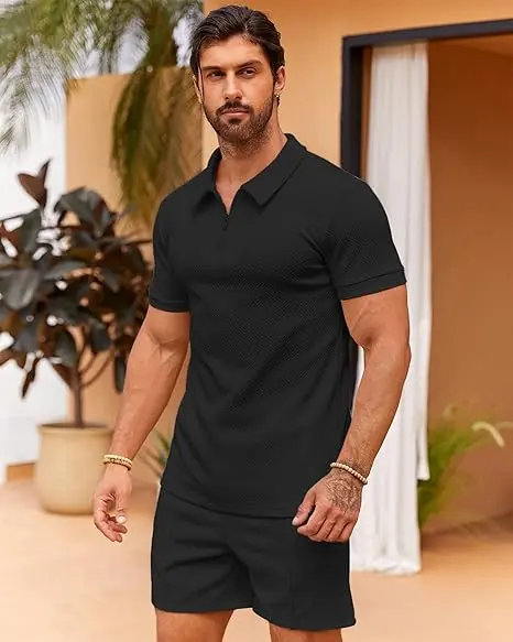 Feature with high-quality fabrics that is breathable and comfortable to wear, advanced texture design, zip neckline, and muscle fit cut. This well-fitting polo shirt and shorts sets will ensure that you look fashionable and put-together.