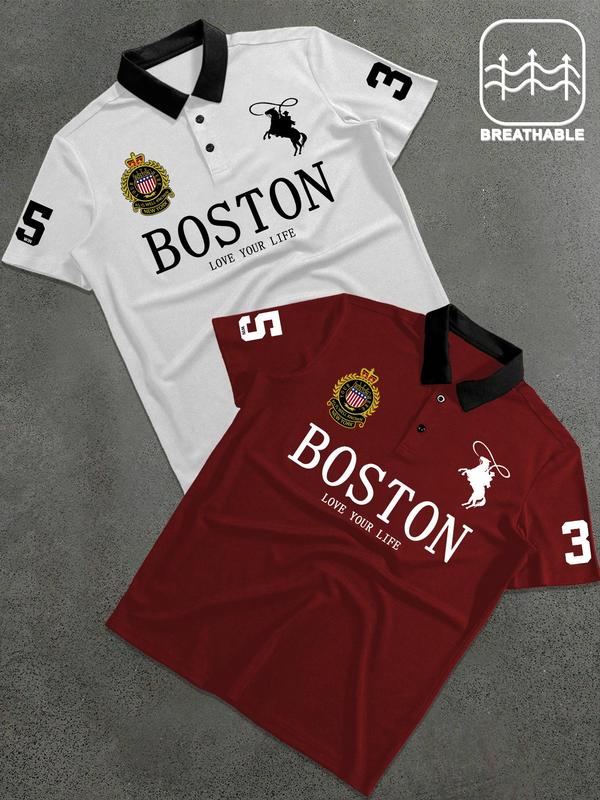 Men's Letter & Number Print Polo Shirt, Fitted Casual Collared, Regular Fit Casual Short Sleeve Top for Daily Outdoor Wear, Fashion Men's Clothes for All Seasons