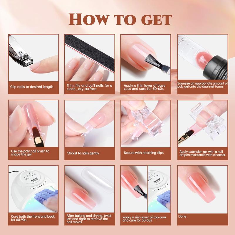 ·EASIER & FASTER:You won’t struggle to try to use our poly nail gel kit. The instructions for using the extension gel are detailed and yet simple to understand.No need to worry about messiness either, as our extension poly nail gel is easy to apply.With this,you can make this poly gel to shape easily and form on dual forms smoothly. The poly extension gel nail kit can make natural and beautiful gel nails within 3 minutes.
