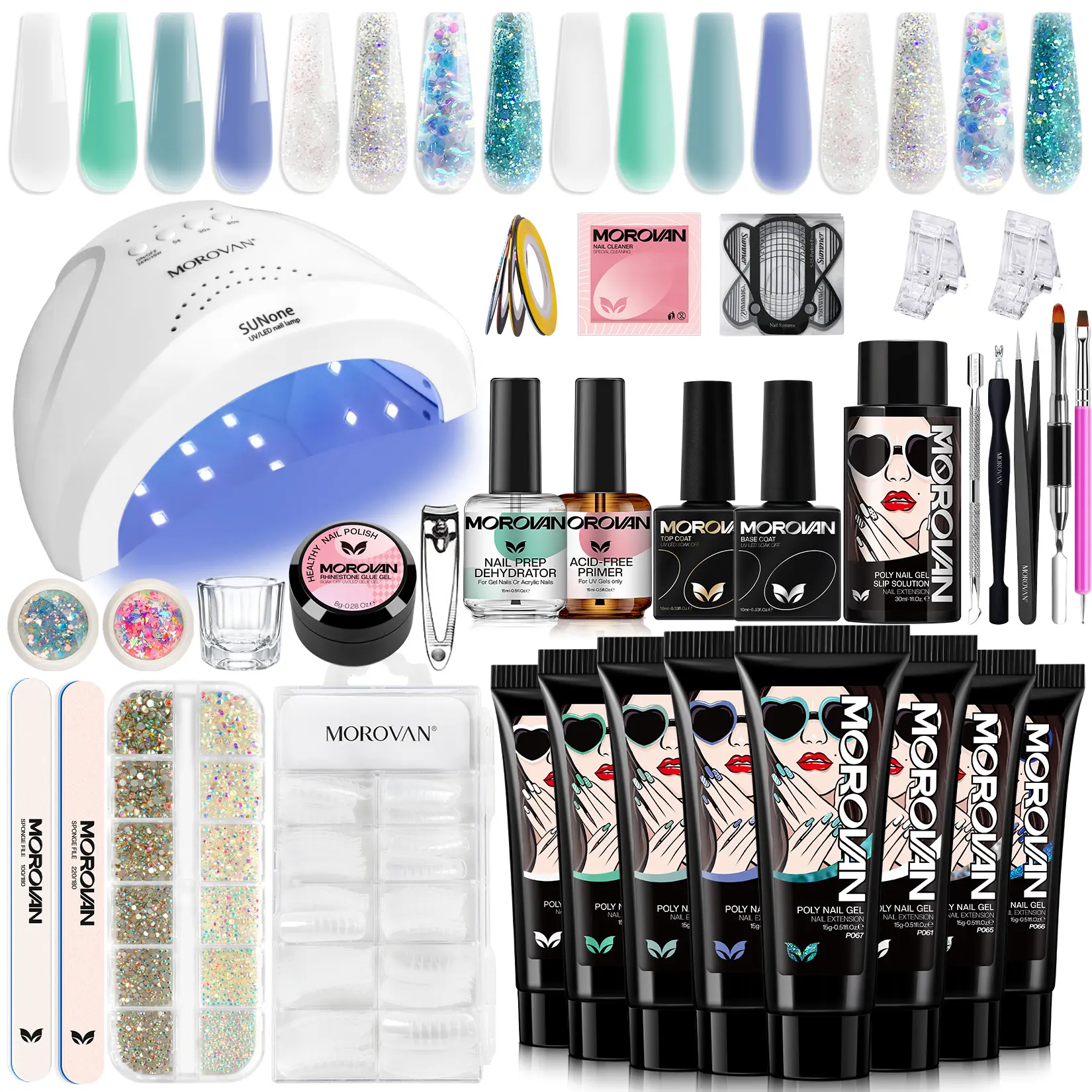 ·MOROVAN POLY NAIL GEL KIT: This Starter Kit contains a complete set of nail art tools that will take you from rusty to skilled and even create a variety of extended nail art.Collect the popular poly gel nail colors in one step,white,pink,milk,nude,brown and two fantastic gradient colors,perfect to match your everyday and party and other occasions.