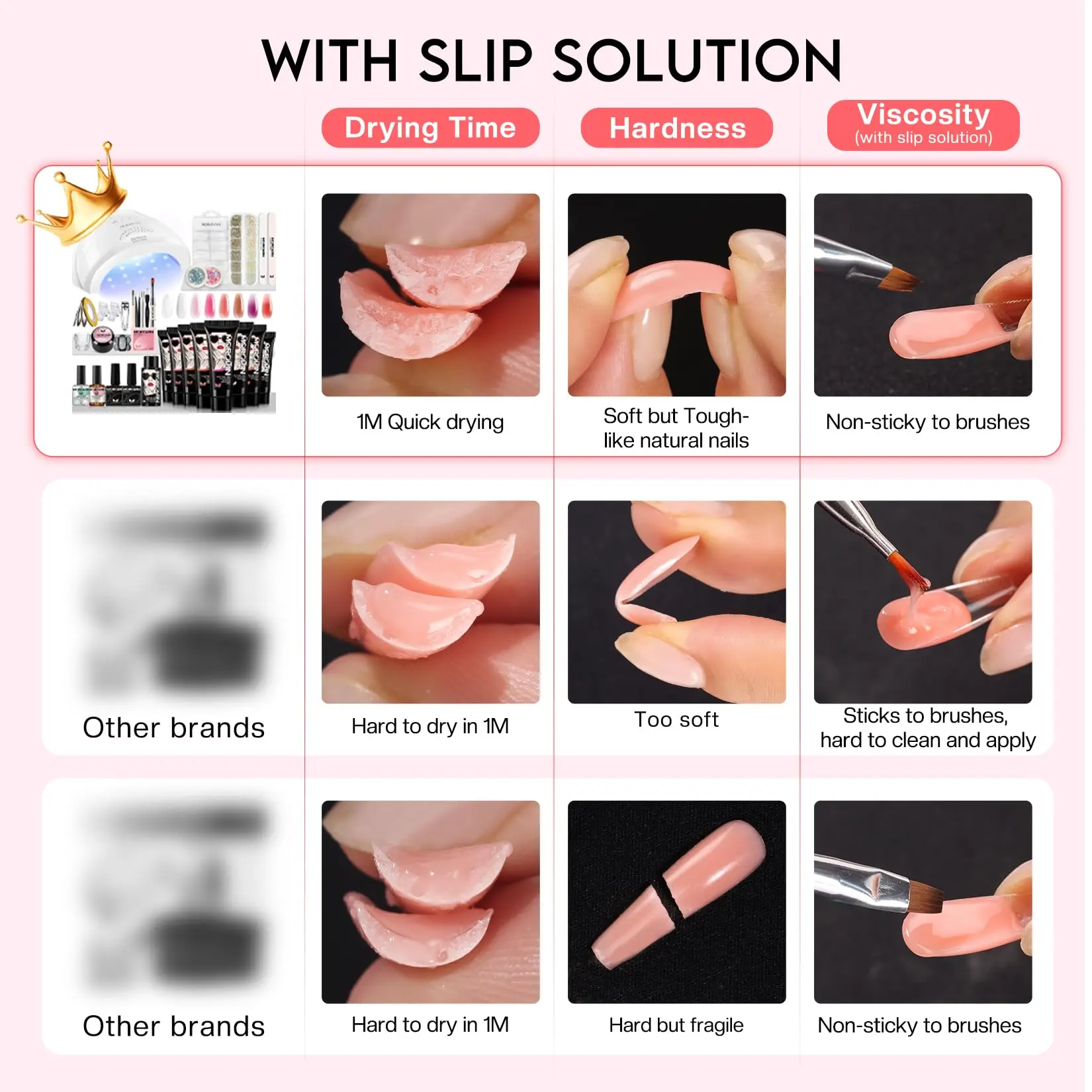 ·WARM TIPS FOR BEGINNERS: For preventing poly gel sticking to the brush or other nail tools,you can dip the brush in a bit of slip solution , so poly nail gel can be picked and formed on dual forms smoothly. If you want to change the nail art style and remove gel from nails, you can file the poly gel down and then buffer it.