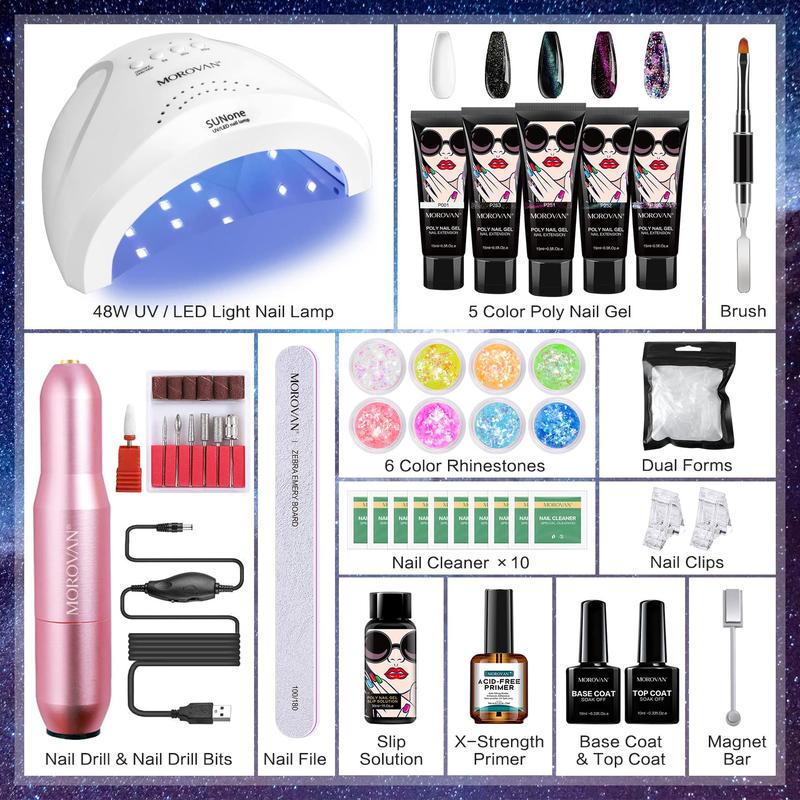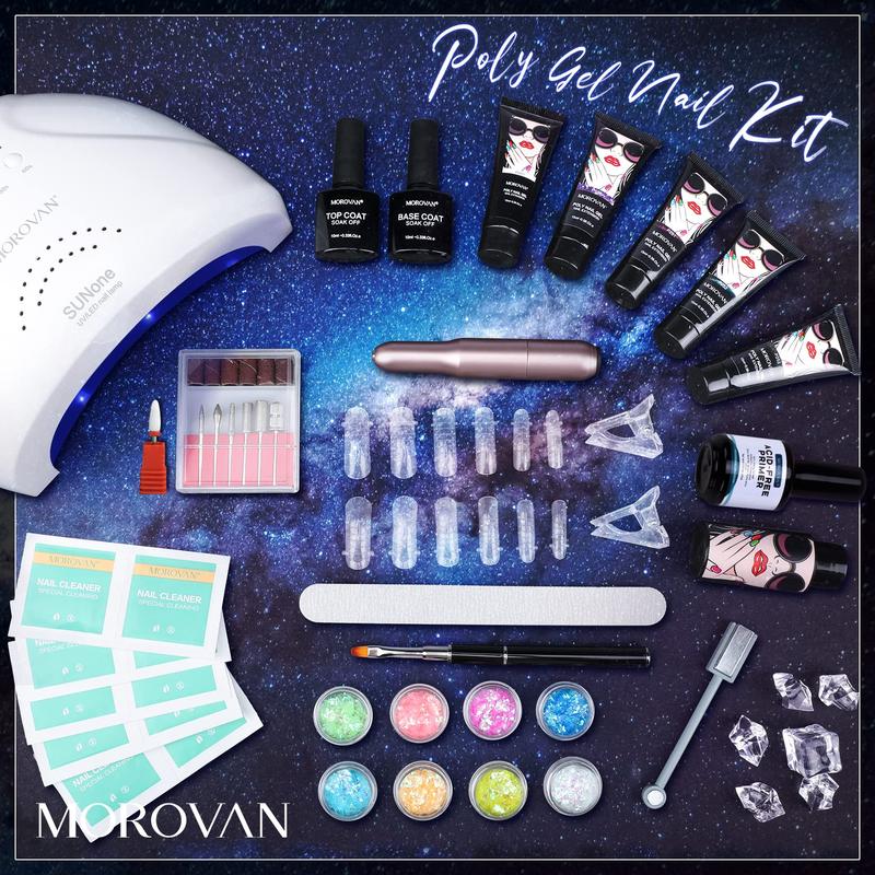 ·💖MOROVAN POLY GEL NAIL KIT WITH LAMP AND DRILL: This perfect poly gel nail kit nail art set contains all the necessary supplies to create trendy poly gel nail looks at home, White poly gel, Purple poly gel, Dark poly gel, and fantastic sequins poly gel, glitter poly gel six kinds popular colors shine your style. Poly gel nail kit with nail lamp 48W and nail drill help you create special beauty poly gel nail arts with other nail art supplies.