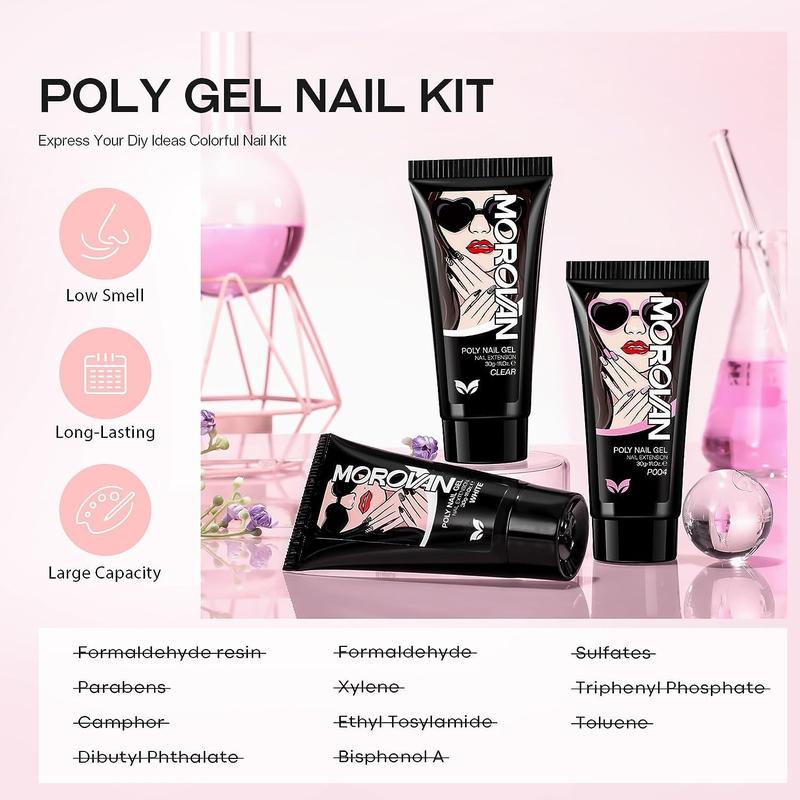 ·HEALTHY & LONG LASTING - Morovan Poly Nail Extension Gel Kit is made from a non-toxic, non-hazardous formula using natural ingredients that keep nails healthy. Compared to other poly gels, Morovan poly nail gels are more durable, easy to shape and less likely to break. The poly gel nail kit also has an all-around curing manicure lamp for beginners that reduces the cure time of the poly nail gel and keeps your nails looking good for more than 28 days.