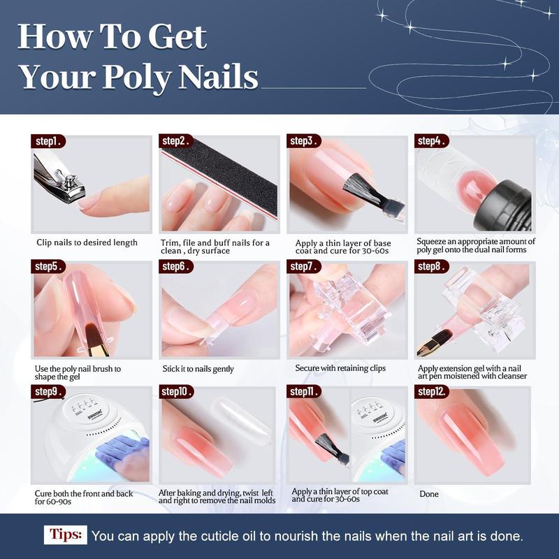 ·[EASIER & FASTER]:You won’t struggle to try to use our poly nail gel kit. The instructions for using the extension gel are detailed and yet simple to understand.No need to worry about messiness either, as our extension poly nail gel is easy to apply.With this,you can make this poly gel to shape easily and form on dual forms smoothly. The poly extension gel nail kit can make natural and beautiful gel nails within 3 minutes.