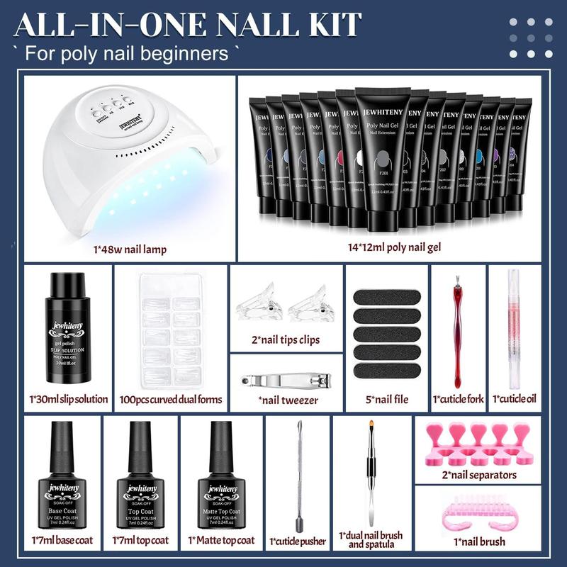 ·[JEWHITENY ALL IN ONE POLY EXTENSION GEL NAIL KIT]: 14 colors poly gel nail kit contain:1*48W Nail lamp,14*12g Poly nail gel, 100pcs dual nail forms in 10 sizes,2*Nail tips clips,1*Base coat,1*Top coat,1*Nail dual brush pen,5*Nail file,1*Nail cutter,other basic poly gel nail art tools.