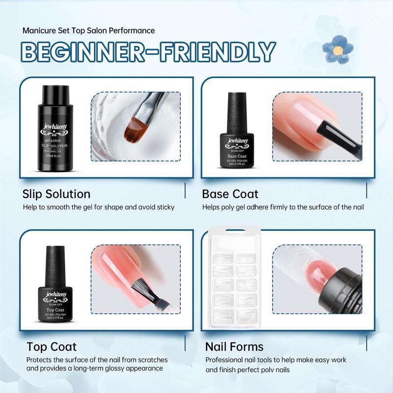 ·[HEALTHY,NATURAL,FLEXIBLE]:JEWHITENY poly gel made with non-toxic ingredients keeping your nails healthy with a low odor formula!superior to other nail extension products, and fits your nails seamlessly。The new upgraded formula makes your lengthened nails as flexible, strong and lightweight as natural growing nails.Double the beauty, but without the extra burden.
