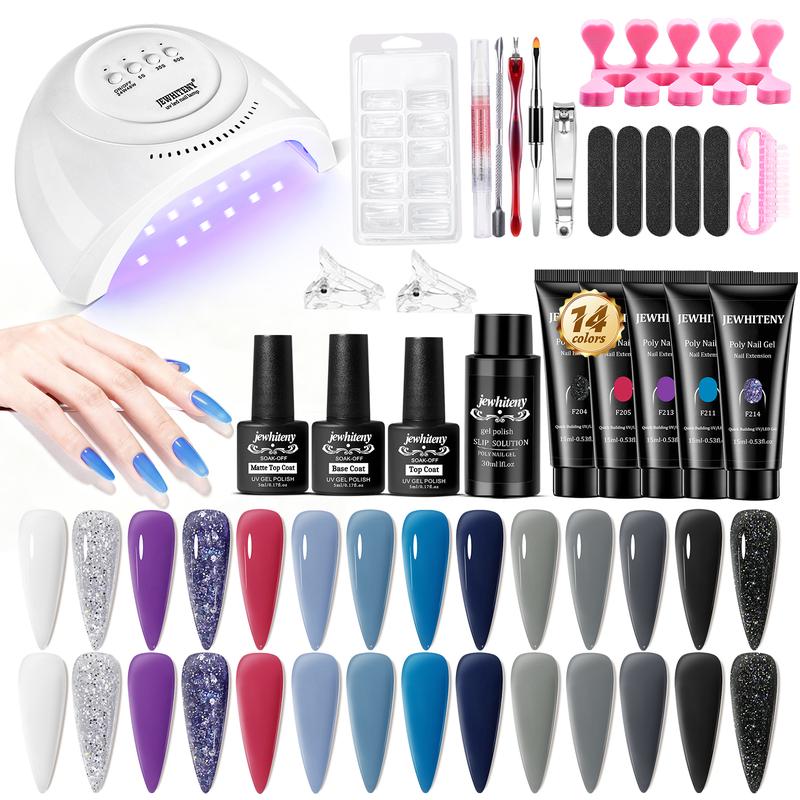 ·[JEWHITENY ALL IN ONE POLY EXTENSION GEL NAIL KIT]: 14 colors poly gel nail kit contain:1*48W Nail lamp,14*12g Poly nail gel, 100pcs dual nail forms in 10 sizes,2*Nail tips clips,1*Base coat,1*Top coat,1*Nail dual brush pen,5*Nail file,1*Nail cutter,other basic poly gel nail art tools.