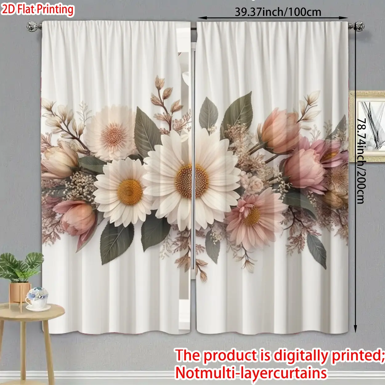 2 pieces, 2D flat printing, polyester materialFlower DecorationPatterned print, light-filtering curtains, Window Curtain, suitable for decorating bedrooms, living rooms, and other settings; features a rod pocket design for easy rod installation.