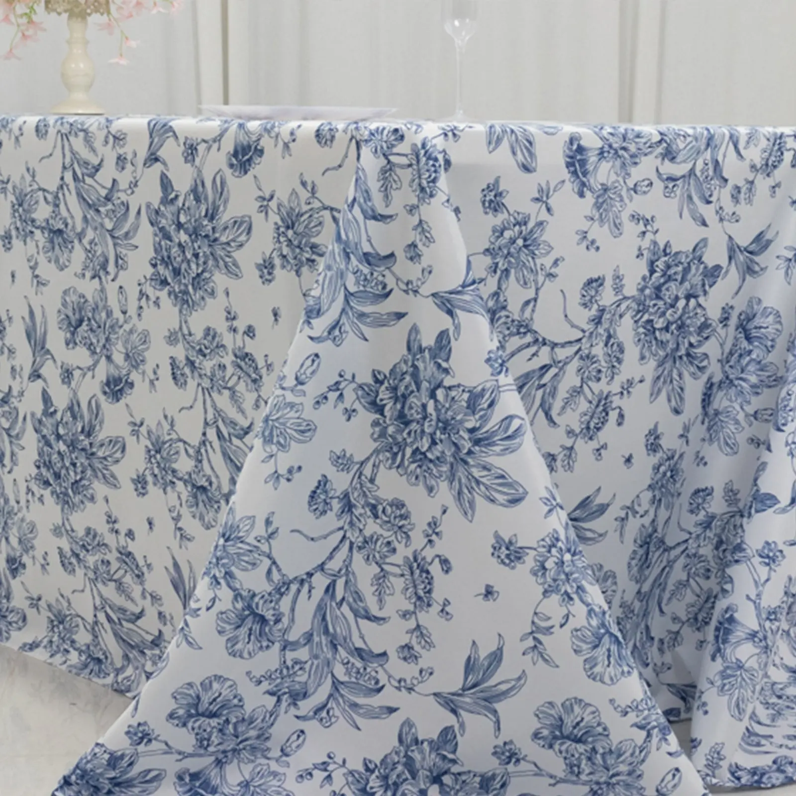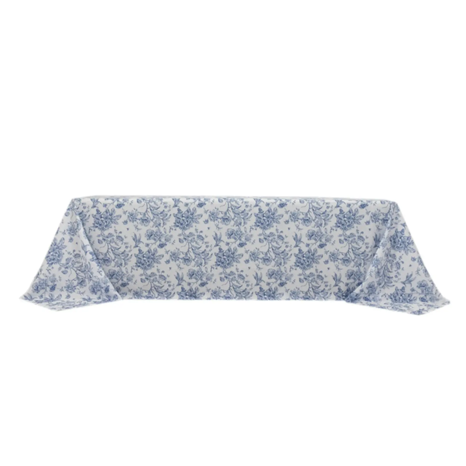 Polyester Rectangular Tablecloth 90"x156" White with Blue French Toile Pattern - Sophisticated Seamless Table Cover for Chic Weddings & Events