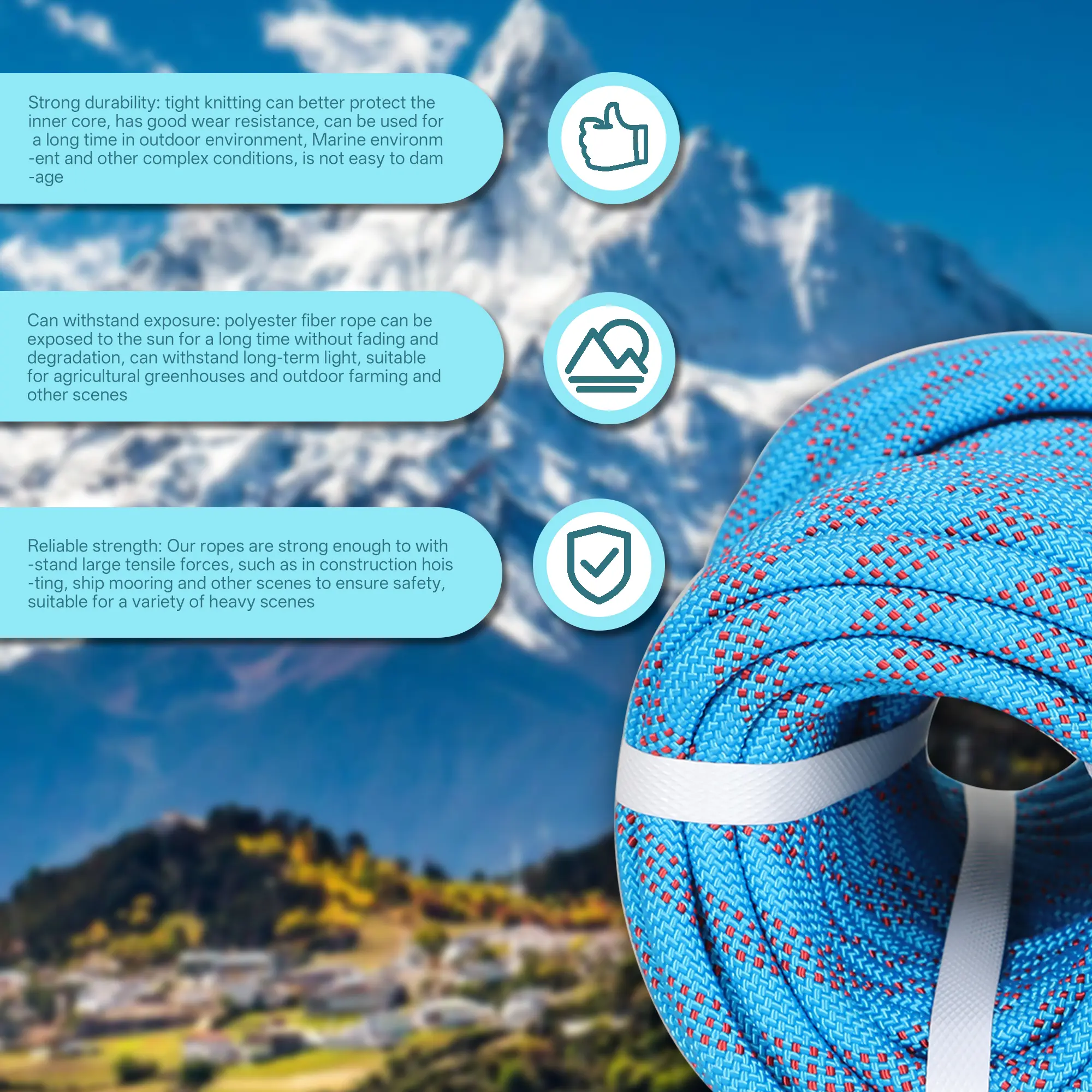 ·Wear resistant and durable, not harden in case of water. The 1/2 inch double braid polyester rope is not limited by the weather, and it can be used normally even in bad weather.