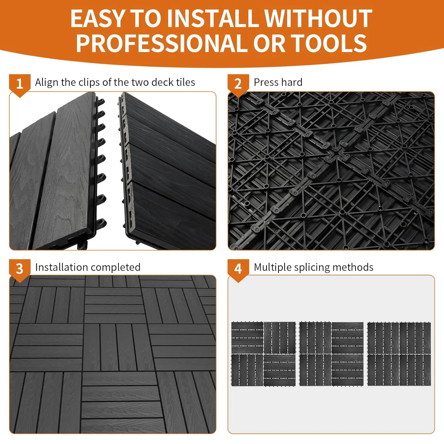 【Simple assembly】: Our composite decking tile features an interlocking design, allowing for easy installation by yourself without the need for tools. Don't worry if you encounter irregular areas. Our composite interlocking deck tiles can be easily cut with , saws and machines.