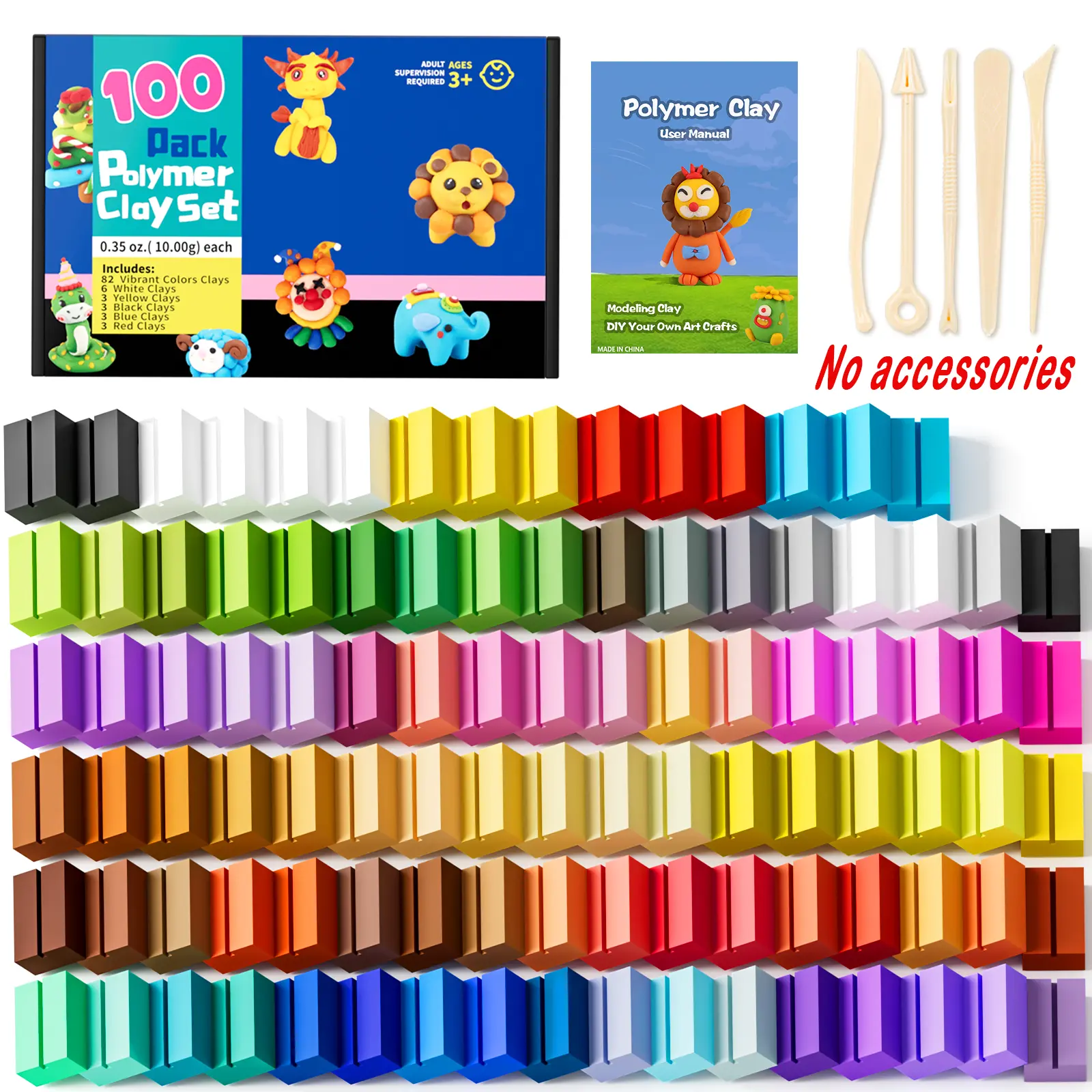 100 pcs small polymer clay, including 5 pcs creative modeling tools and an instruction manual. This collection features 82 pcs vibrant colors and 18 pcs basic colors.