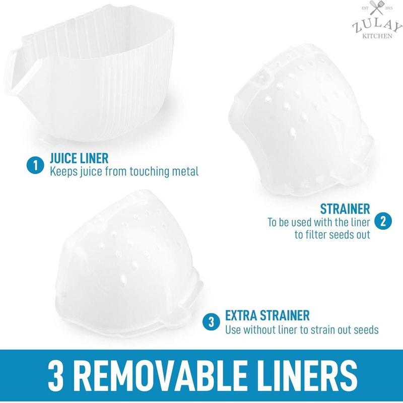 ·Additional Inserts That Matter: This set includes three useful inserts: two filters and one cup. The detachable strainers effectively filter out seeds during juice extraction, while the juice liner cup separates the juice from the metal material to maintain flavor and freshness.