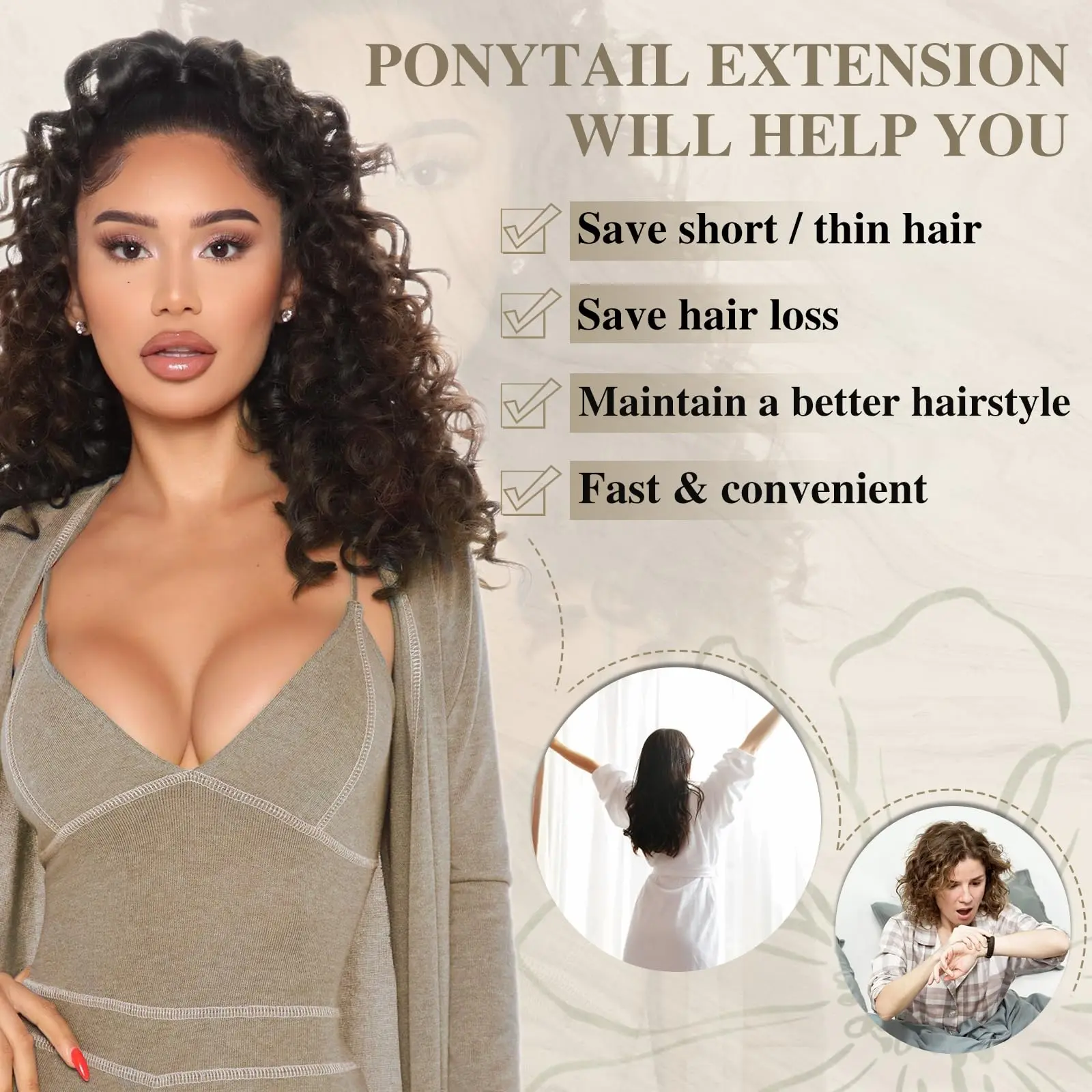 ·【Easy to Wear】: Just put your hair into a bun,and clip in ponytail to your bun, then pull the elastic to secure it into your own hair.Before installing, please shake and comb the ponytail extension with your fingers, the curls will be more natural, thick and fluffy.