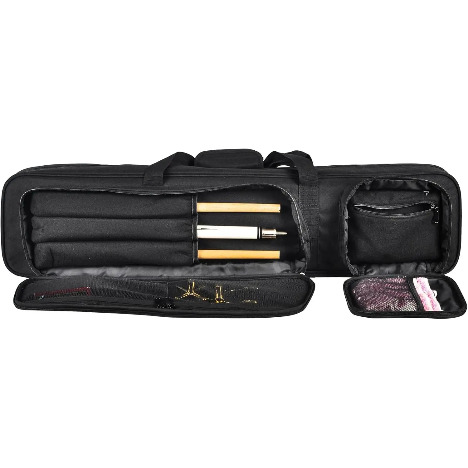 With its spacious main compartment accommodating up to 4 butts and 5 shafts, our billiard cue case also features multiple pockets for smaller accessories like extensions, cue chalk, gloves, and more. It makes everything you need for the game well organized.