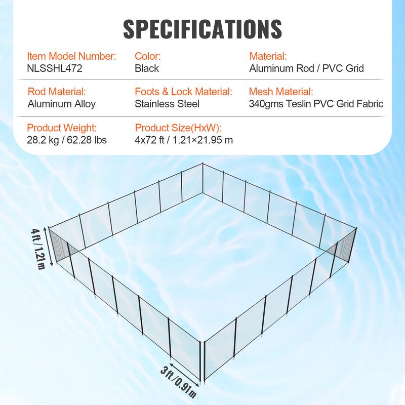 • Comprehensive Protection: Our 4x72 ft/1.21x21.95 m pool fence offers versatile fitting for different pool shapes and sizes, especially for large pools. It not only ensures pool safety but also effectively protects pets and children, serving as your family's guardian.