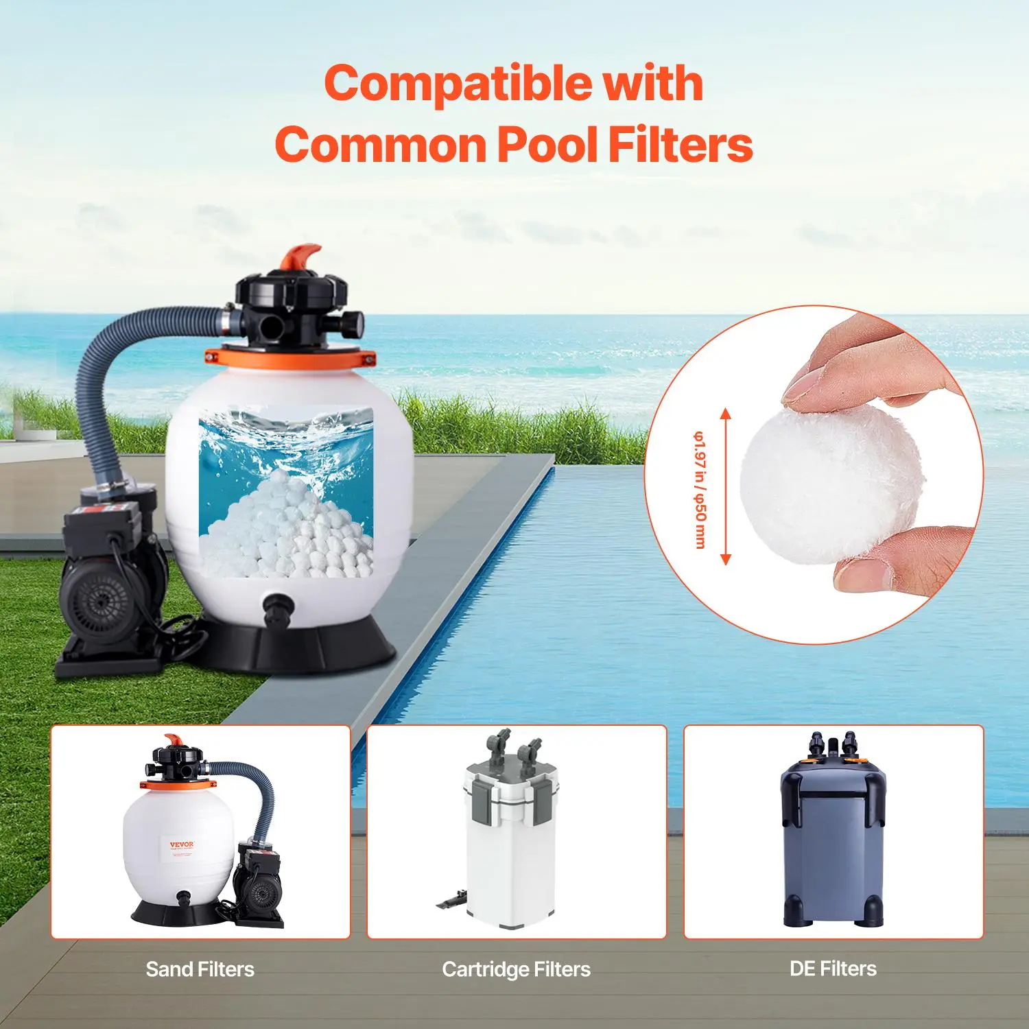 • High Compatibility: Our pool filter balls are compatible with a variety of common filter systems, including sand filters, cartridge filters, and DE filters, ensuring seamless performance across multiple setups.
