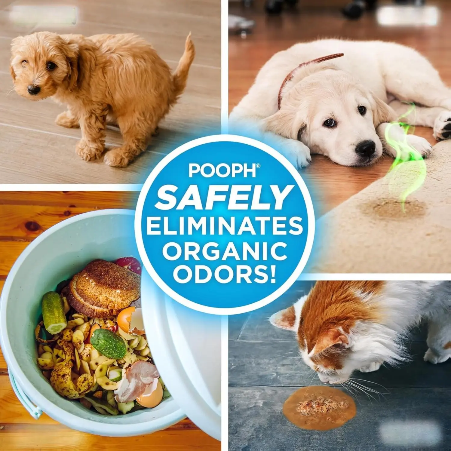 POOPH SAFELY eliminates odors from carpets, rugs, upholstery, drapes, and hard surfaces. It's ideal for urine, feces, vomit, spoiled food, garbage cans, and more. It leaves no chemical residuals or fragrances behind.
