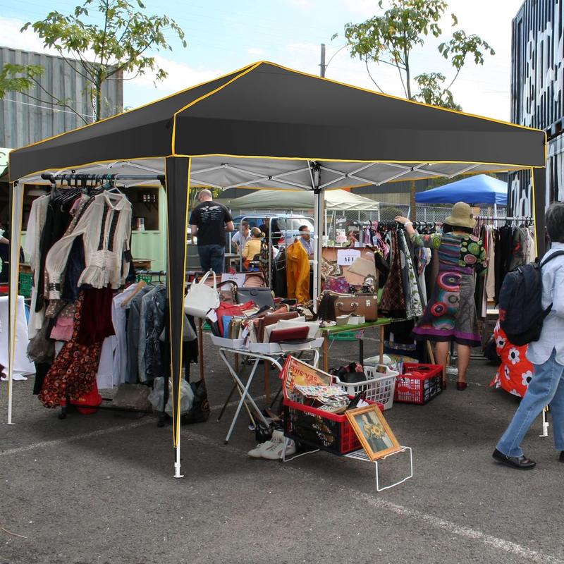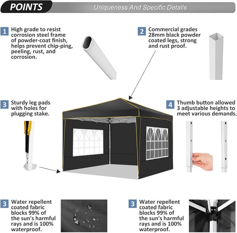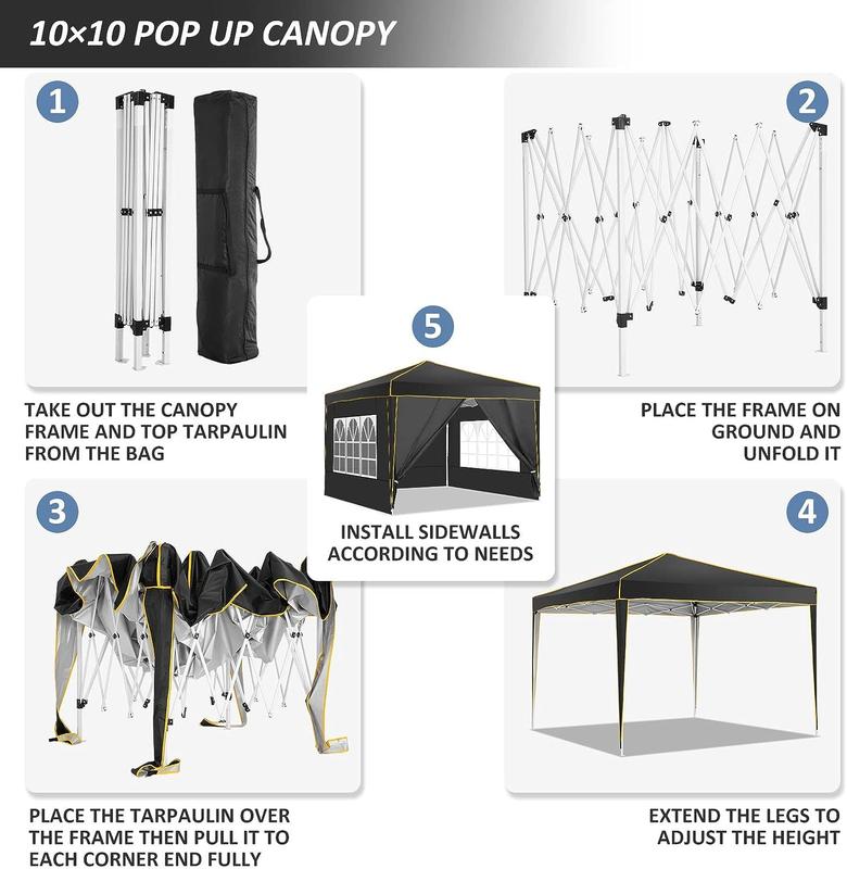 【Full set of support parts】10 x 10 ft pop-up canopy frame, 10 x 10 ft canopy top tarp, 4 removable oxford side walls, 1 storage bag, 4 sandbag, 4 tent stakes and 4 rope.