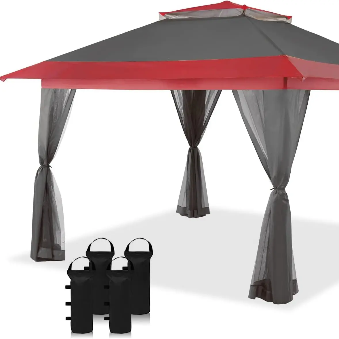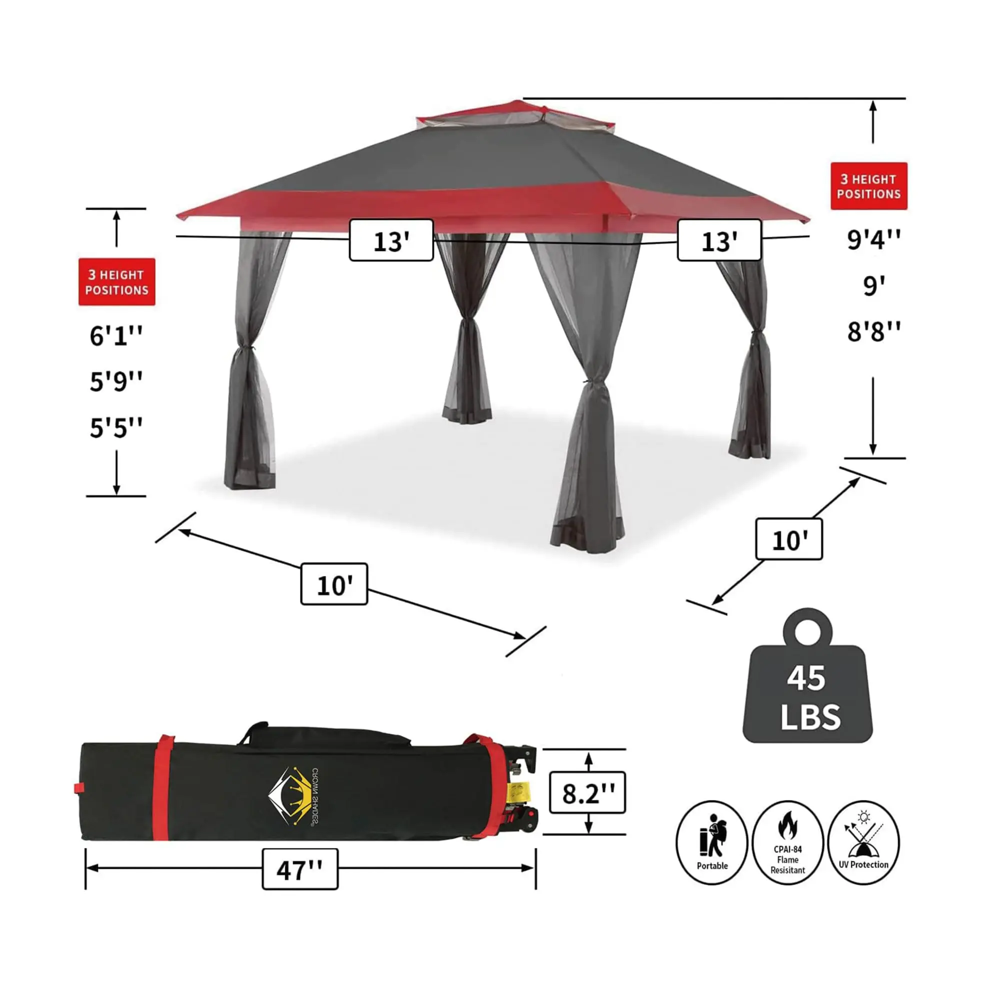 ·[LARGE SPACE]: Base dimensions are 10' x 10'. Canopy dimensions are 13' x 13' with 169 square feet of shade. Over 9’ maximum interior height, and over 6’ maximum clearance under the valance. Plenty of standing room, and 14 people can sit comfortably in the cool shade.