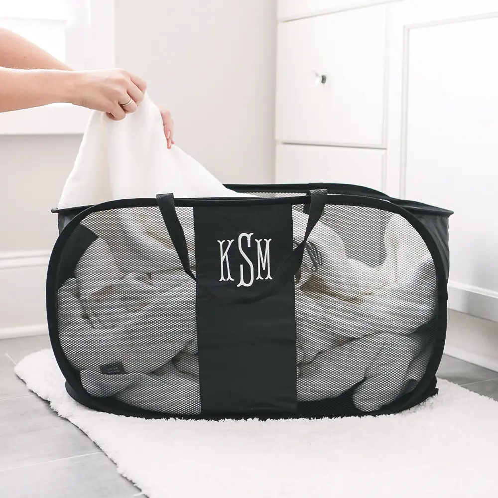 Introducing our Monogrammed Pop Up Hamper, the perfect blend of style and functionality for your home. This basket effortlessly collapses for convenient storage when not in use, making it ideal for small spaces. Say goodbye to clutter and hello to organized charm with our Monogrammed Pop Up Hamper.