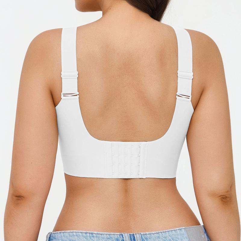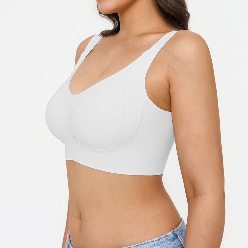 • All-Day Comfort Support for Full Busts Full-coverage cup + widened shoulder straps design offers stable lift, relieves shoulder pressure, and ensures all-day comfort. • Multi-Layer Lifting Structure for Anti-Sag Support 3-layer cup lifting system + wire-free supportive structure, combined with high-density elastic fabric, provides secure lift without shifting. • Breathable Molded Cup – Light & cool Perforated cup design ensures dryness and breathability for skin-friendly comfort. • Designed to combat sagging with built-in lift and seamless support for a naturally sculpted look.