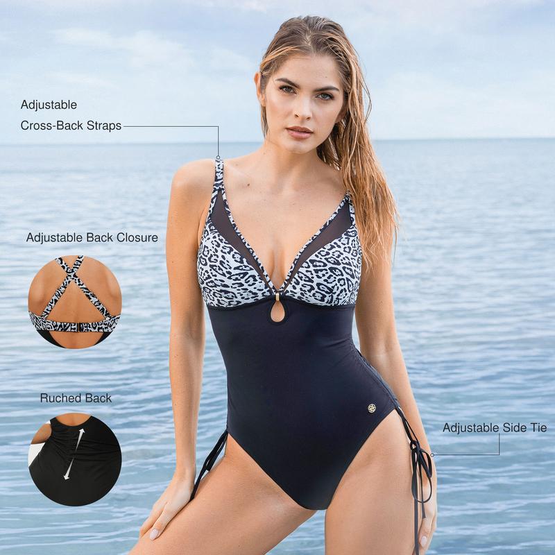 ✨ Elegant Design: This swimsuit features a deep V-neck, adding a touch of sophistication. The black & white leopard print offers a bold, stylish look. The sheer mesh adds a delicate, airy feel. Perfect for those who love a blend of elegance and boldness.