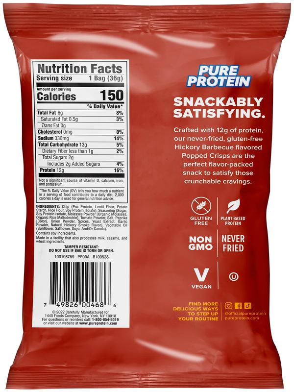 Take a bite of a protein snack that POPS! Pure Protein Hickory Barbecue Popped Crisps are a new flavor-packed protein snack to satisfy those crunchable cravings. Crafted with 12g of protein, our Popped Crisps are big on flavor and crunch, yet never fried. They are made with plant-based protein and are gluten-free, non-GMO, and vegan friendly. So whether you’re snacking at home or on-the-go, grab a bag of Pure Protein Popped Crisps for a delicious, portable protein snack. Snackably satisfying!