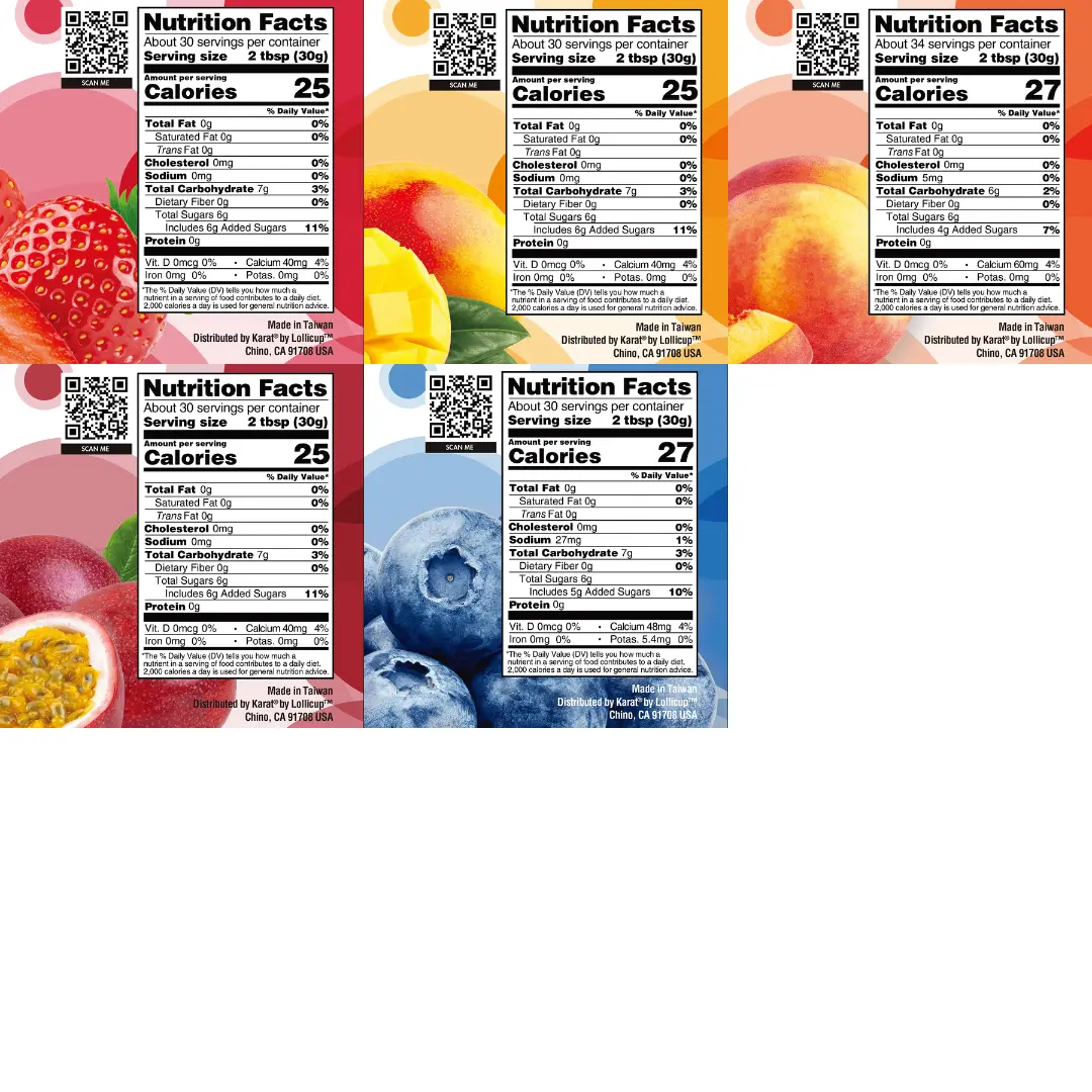 ·Passion Fruit: Water, Sugar, Passion Fruit Syrup, Starch, Calcium Lactate, Seaweed Extract, Citric Acid, Flavor, FD&C Yellow No.6, Potassium Sorbate