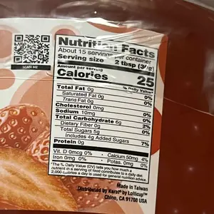 ·Strawberry: Water, Fructose, Starch Acetate, Calcium Lactate, Citric Acid, Sodium Alginate, Xanthan Gum, Strawberry Flavor, Calcium Chloride, Potassium Sorbate, Sodium Erythorbate, Sucralose, FD&C Red NO. 40, CMC